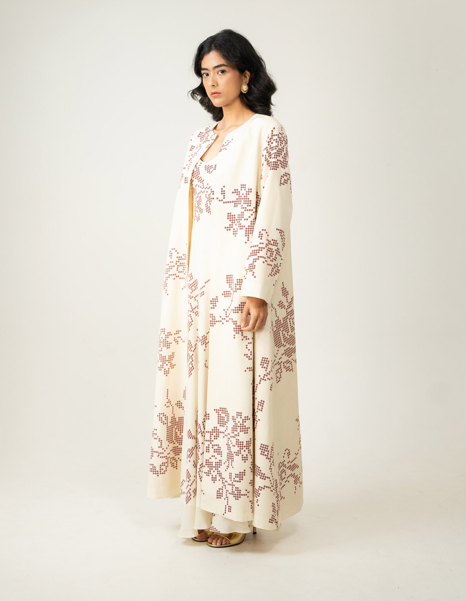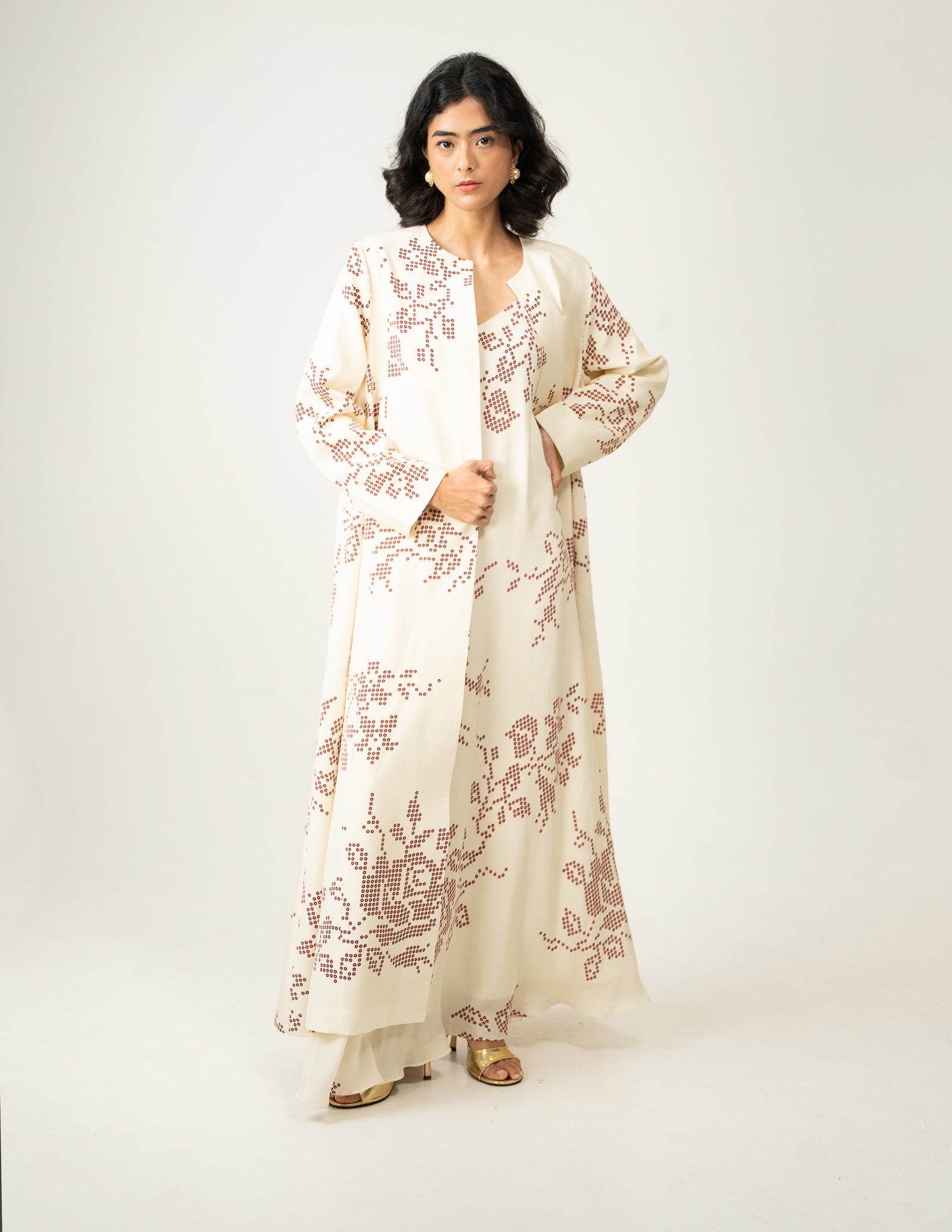 A two-piece crepe set featuring digitally printed reimagined cross stitch motifs interpreted in the timeless language of bandhani.