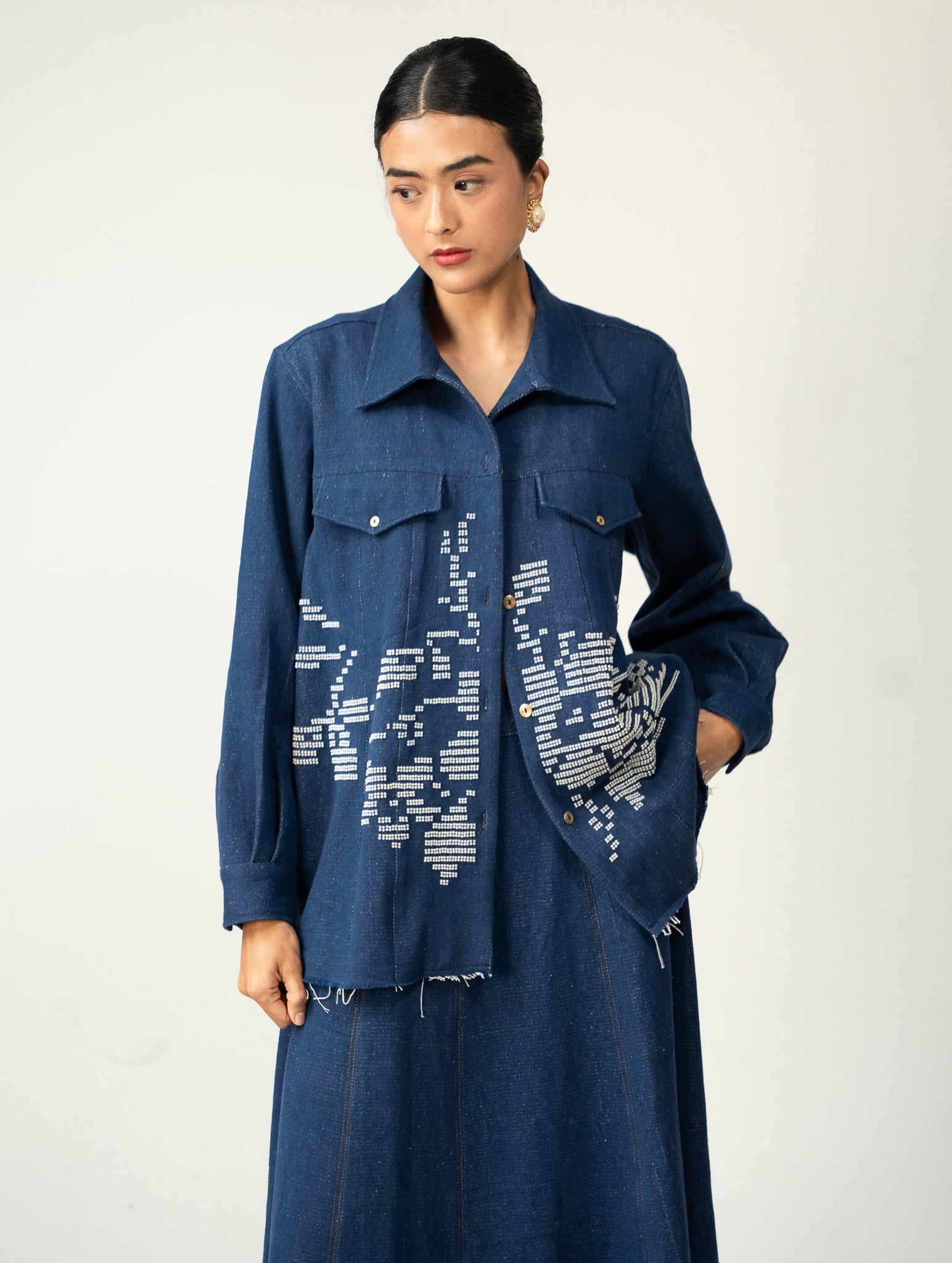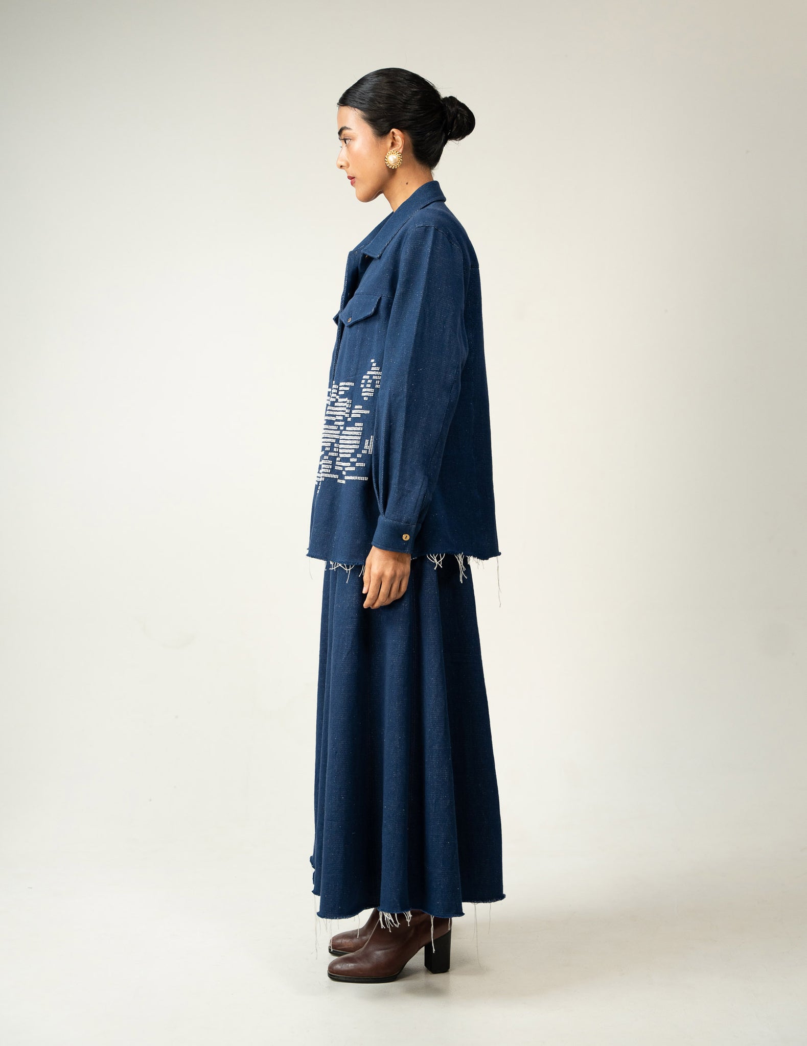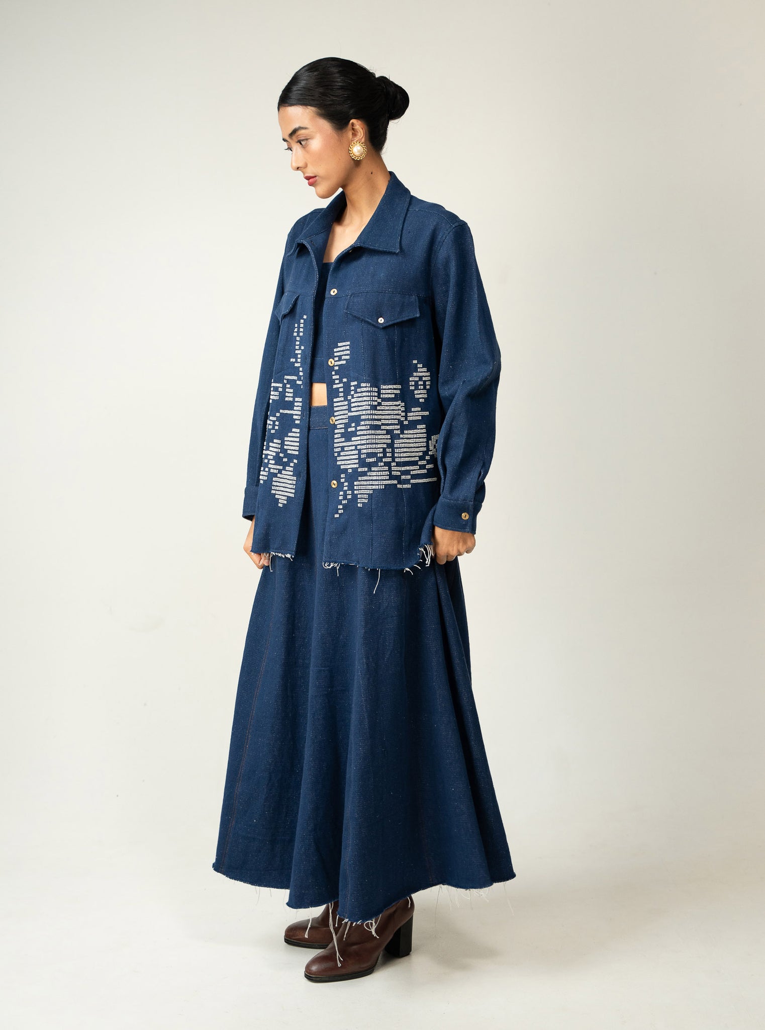 A three-piece denim set featuring whispering tales of hand embroidered beaded flora.