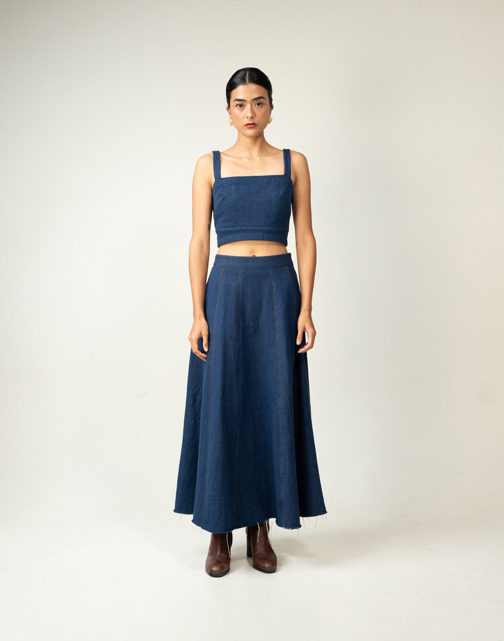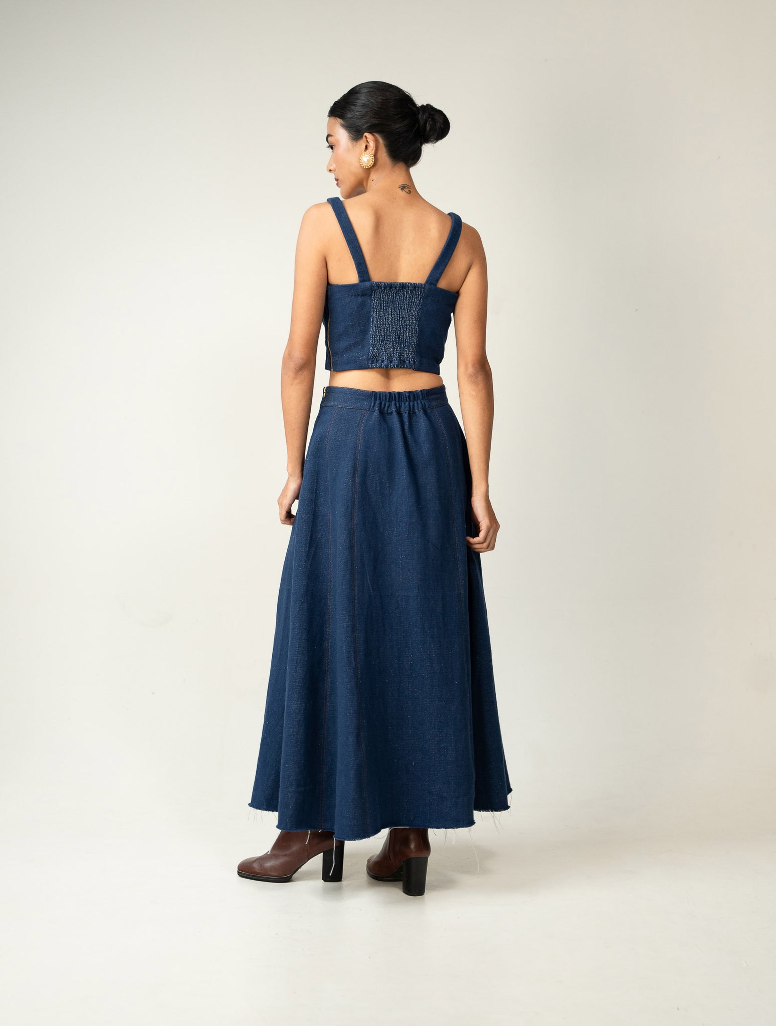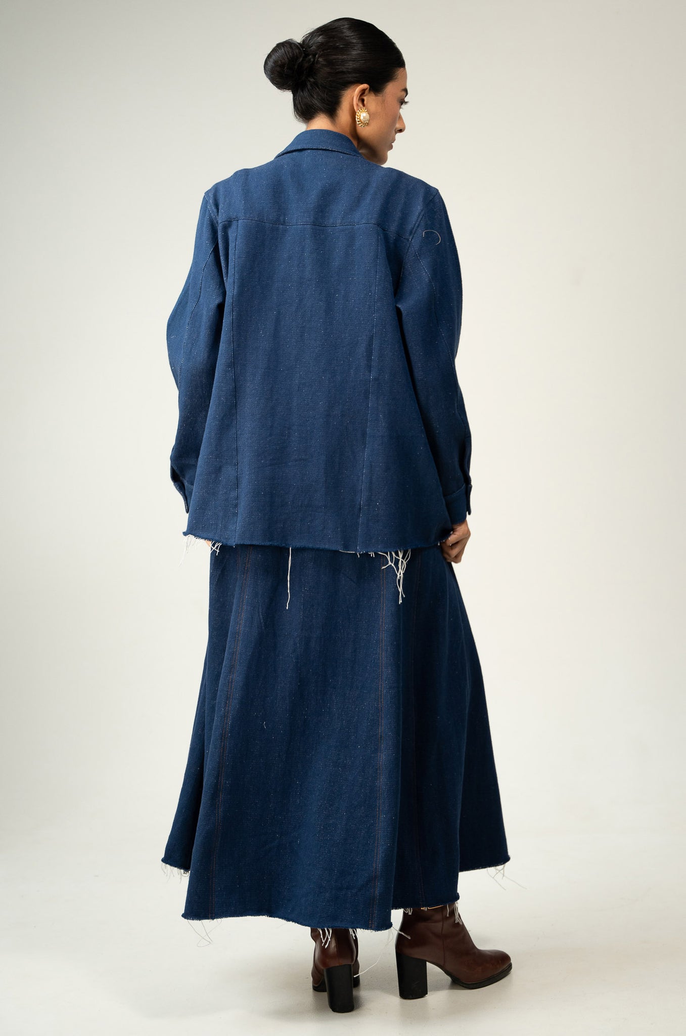 A three-piece denim set featuring whispering tales of hand embroidered beaded flora.