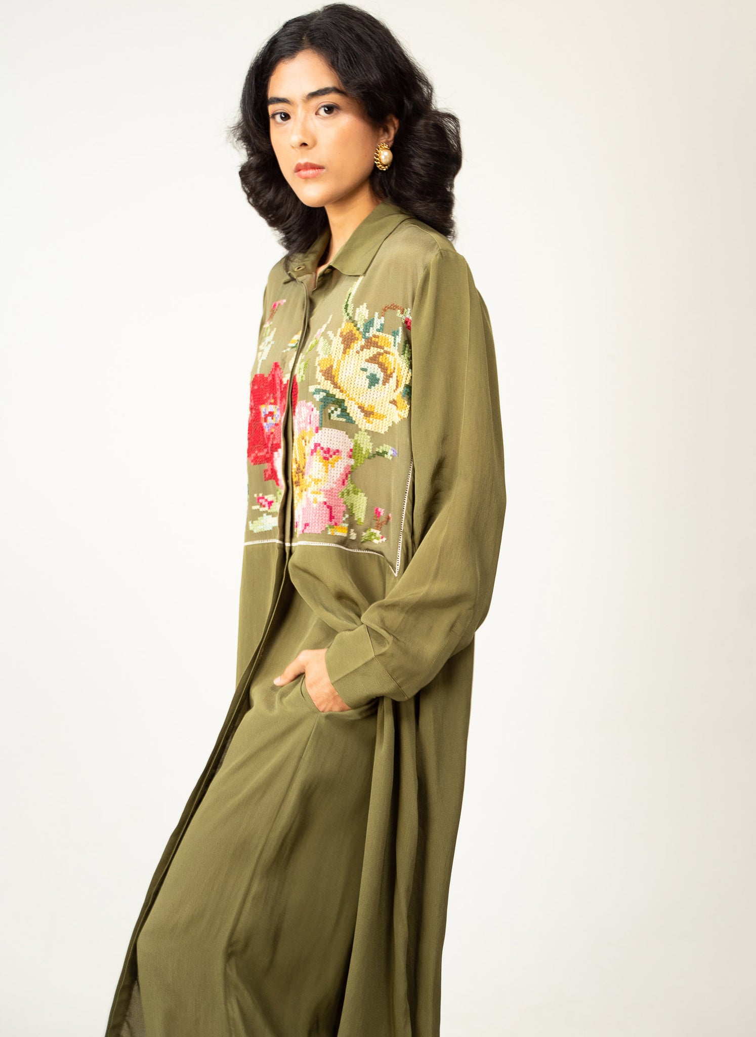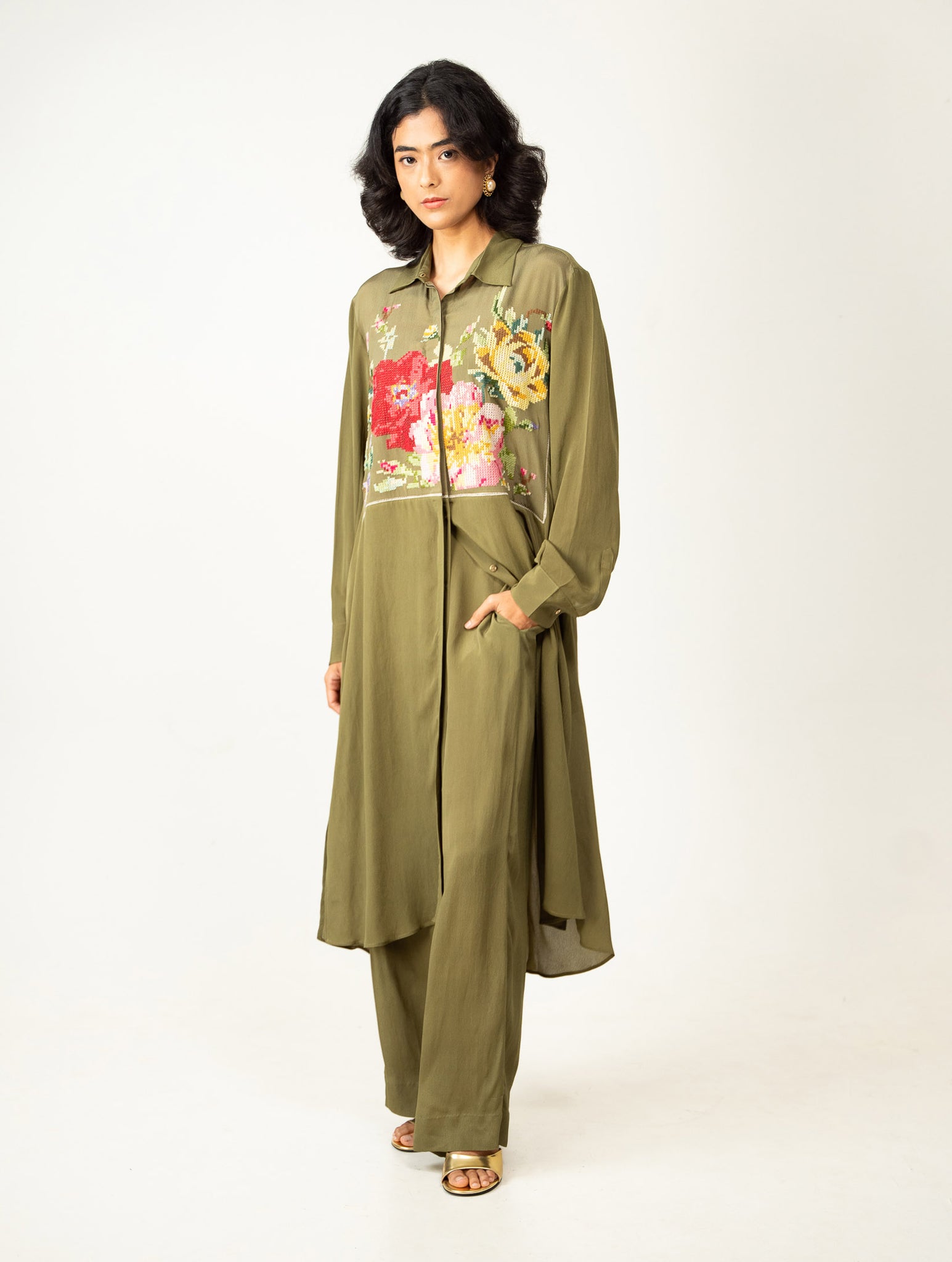 Step into elegance with our exquisite hand-embroidered cross-stitch co-ord set, designed for the modern woman who celebrates a thing of beauty.