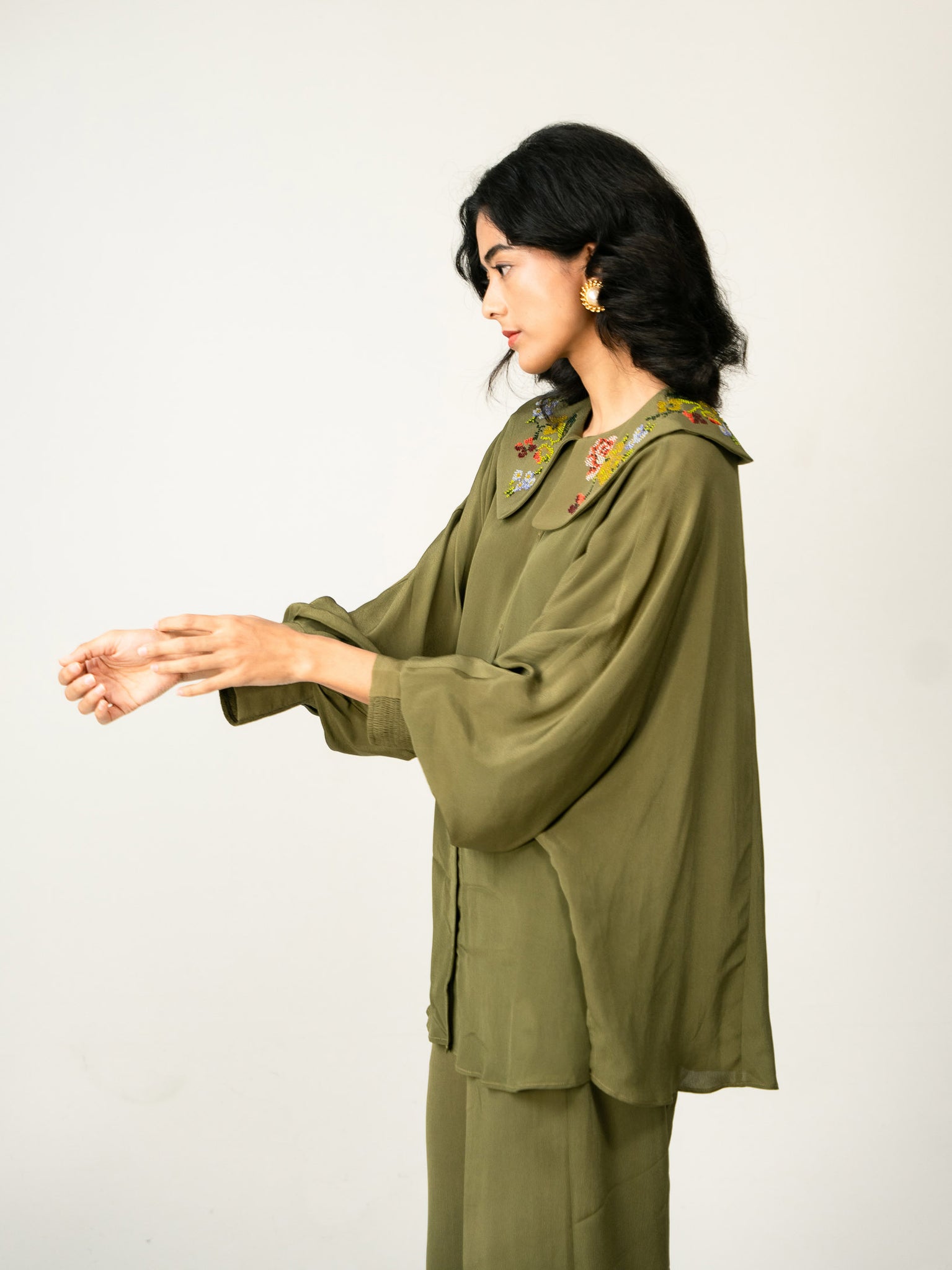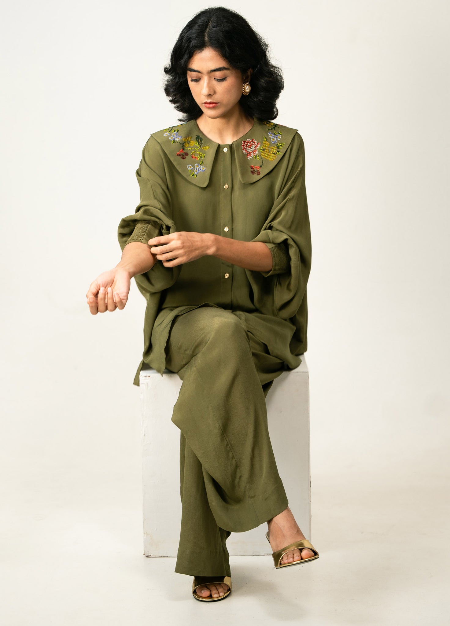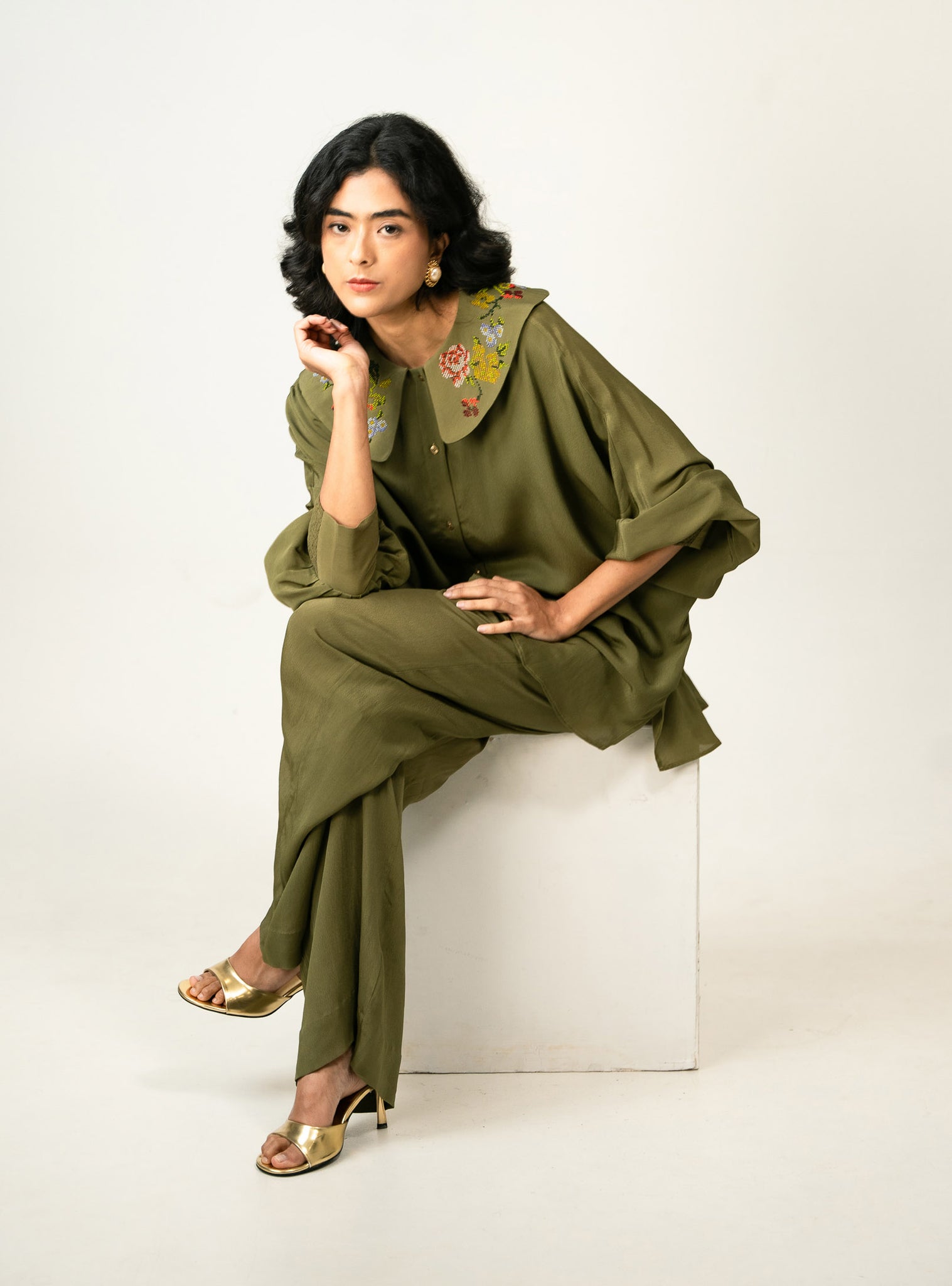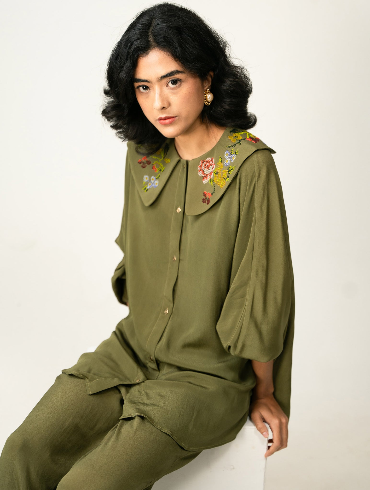 Delicate bead embroidery rests on the collar—a small detail that feels calm and intentional, carrying a quiet sense of nostalgia in the two-piece co-ord set.