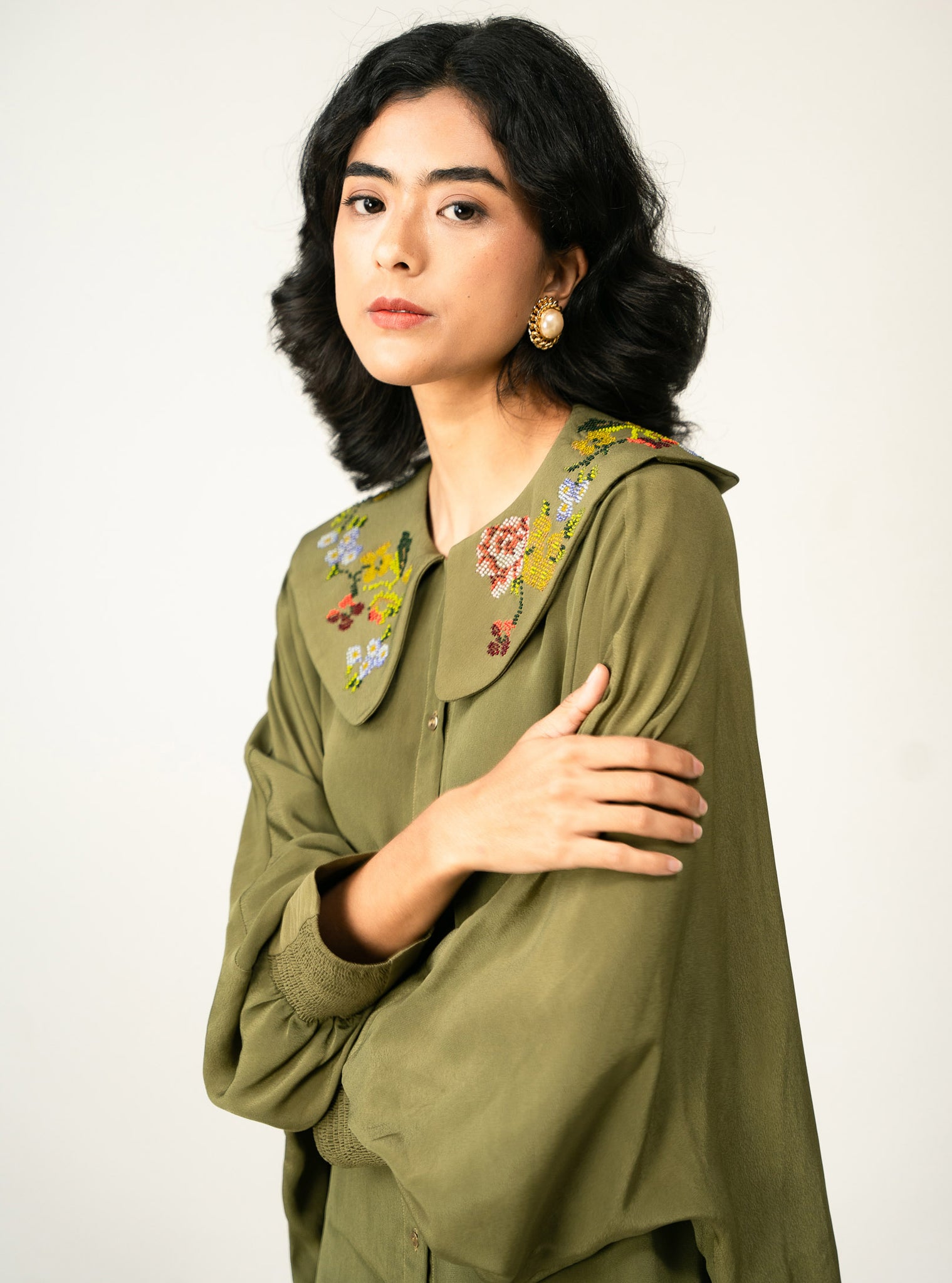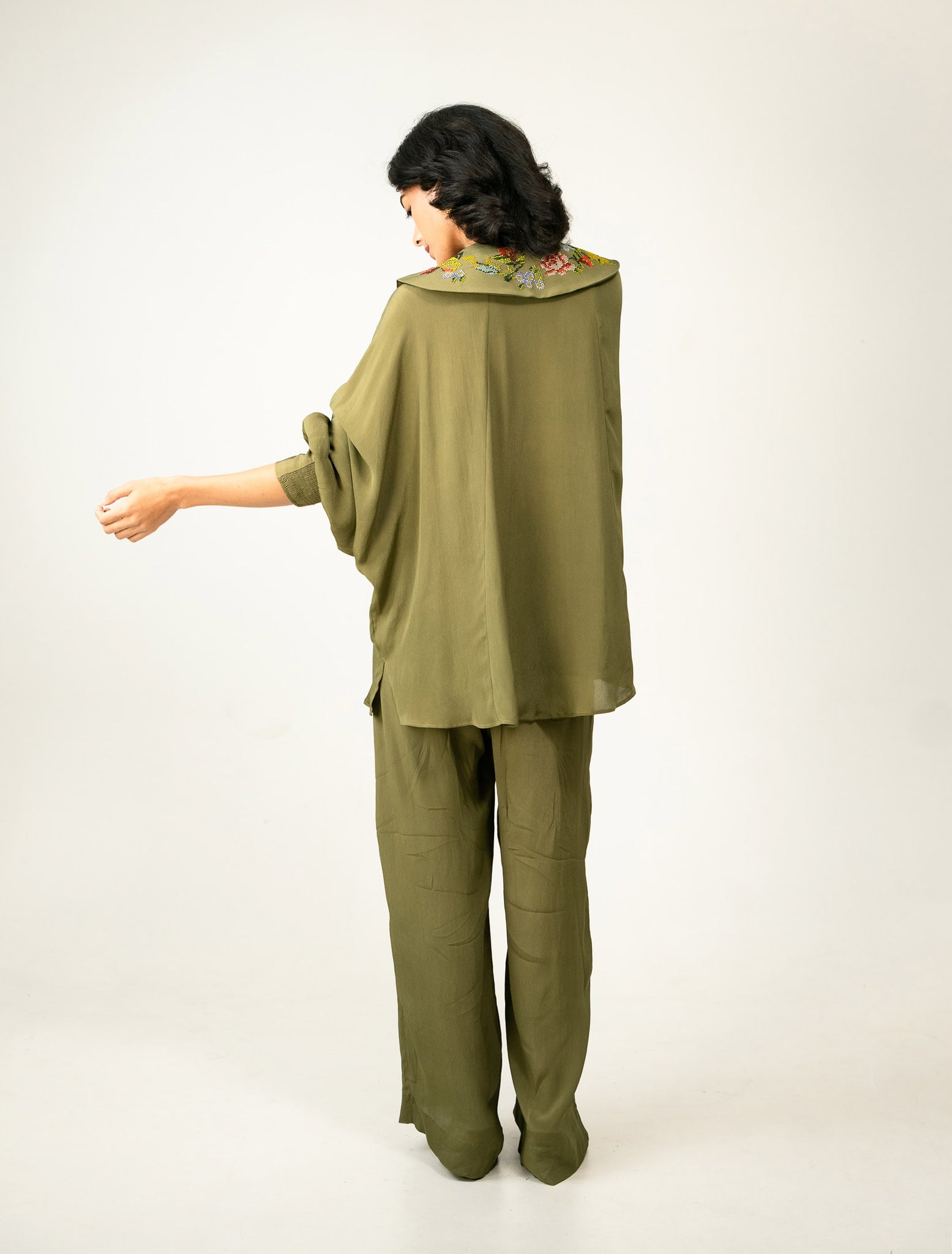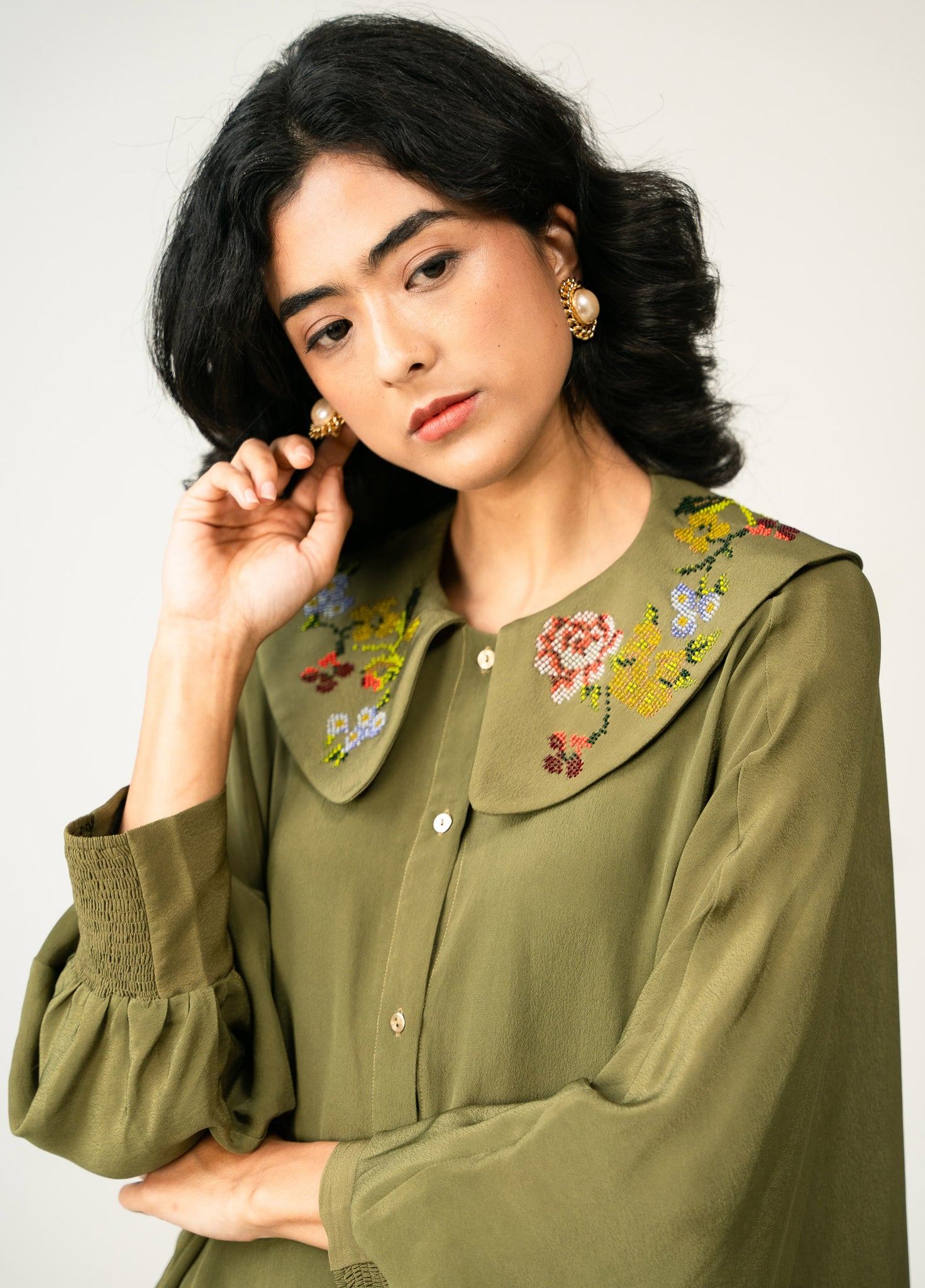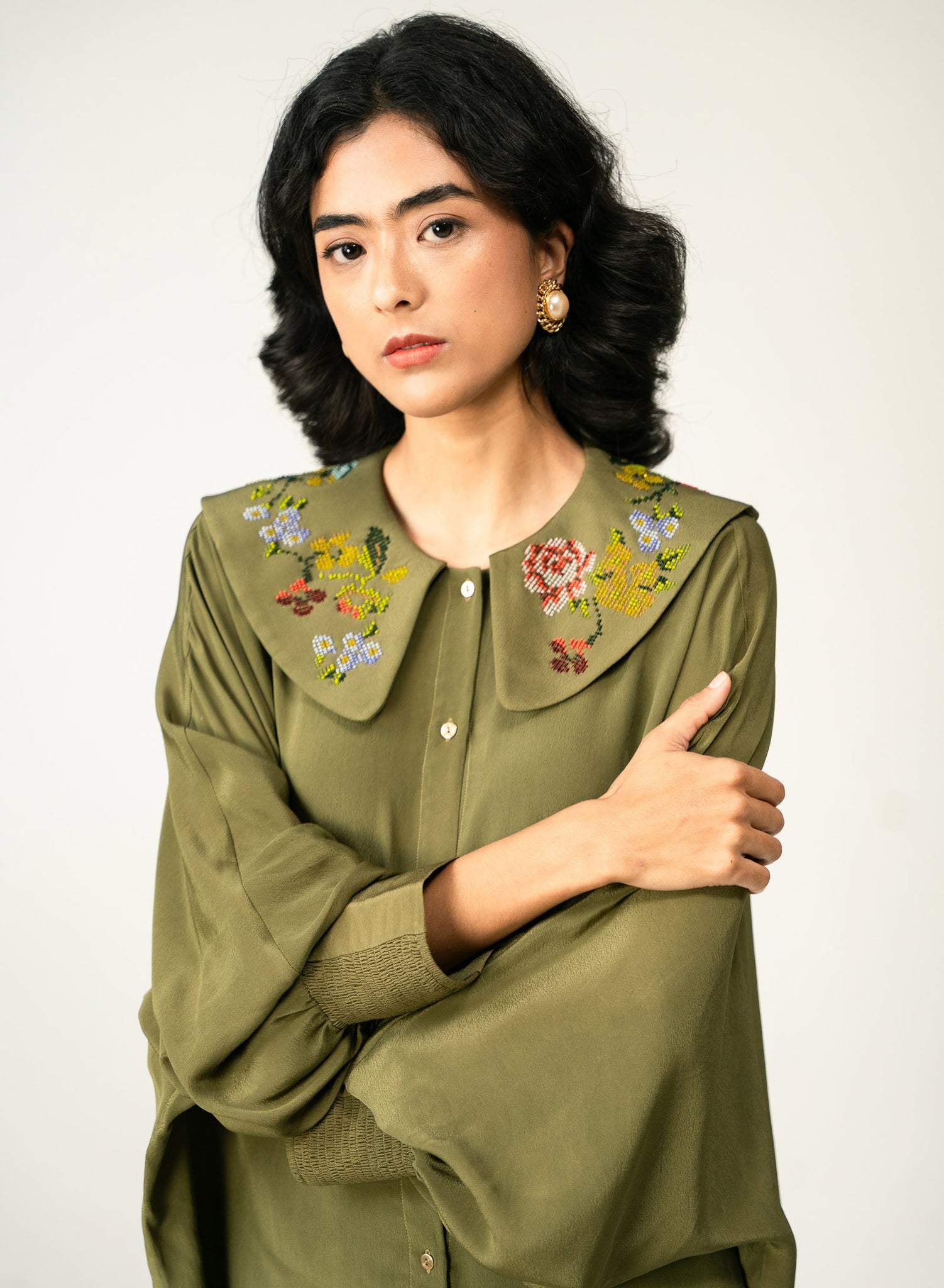 Delicate bead embroidery rests on the collar—a small detail that feels calm and intentional, carrying a quiet sense of nostalgia in the two-piece co-ord set.