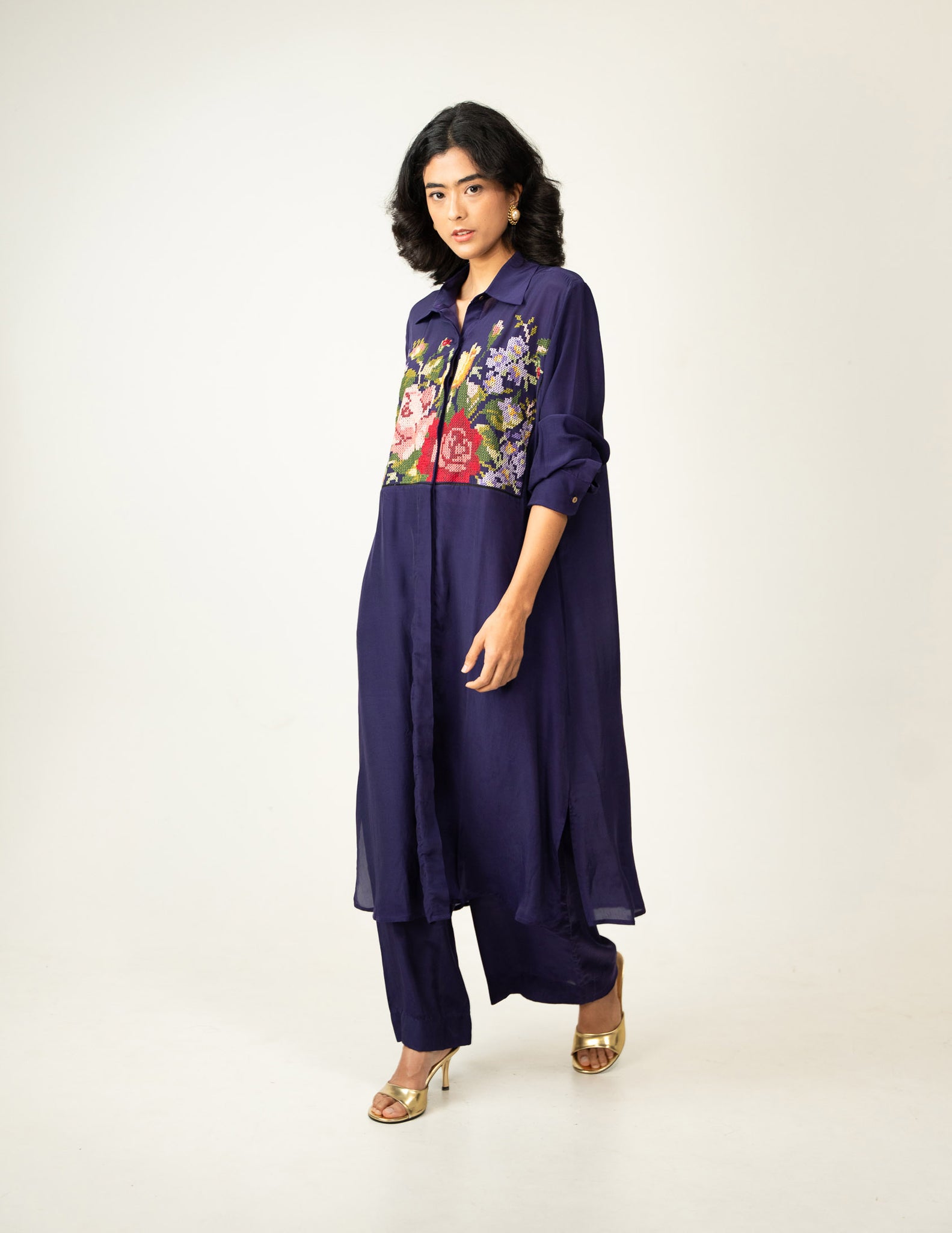 A flowy, hand-embroidered co-ord set featuring our signature cross-stitch blooms.