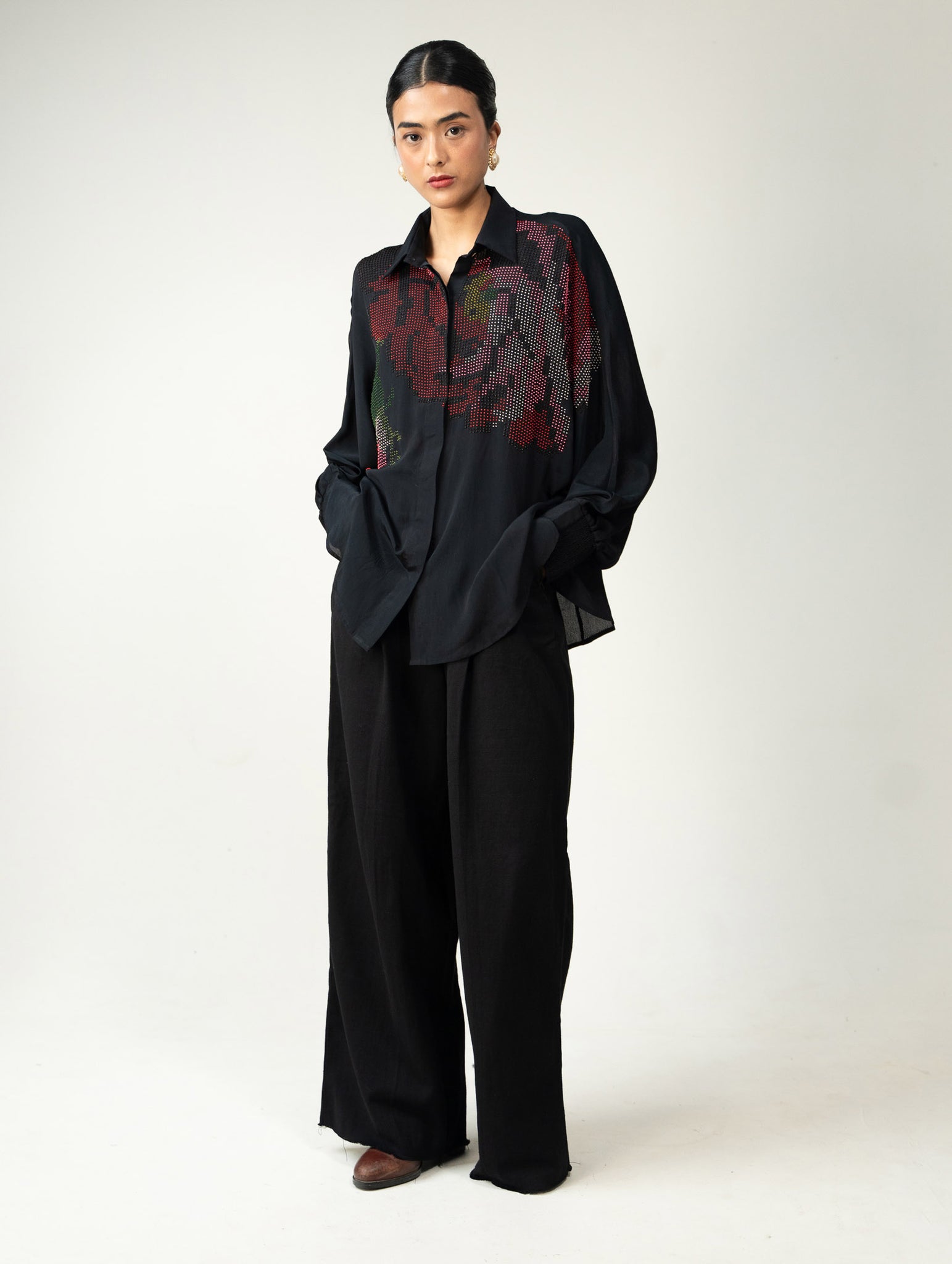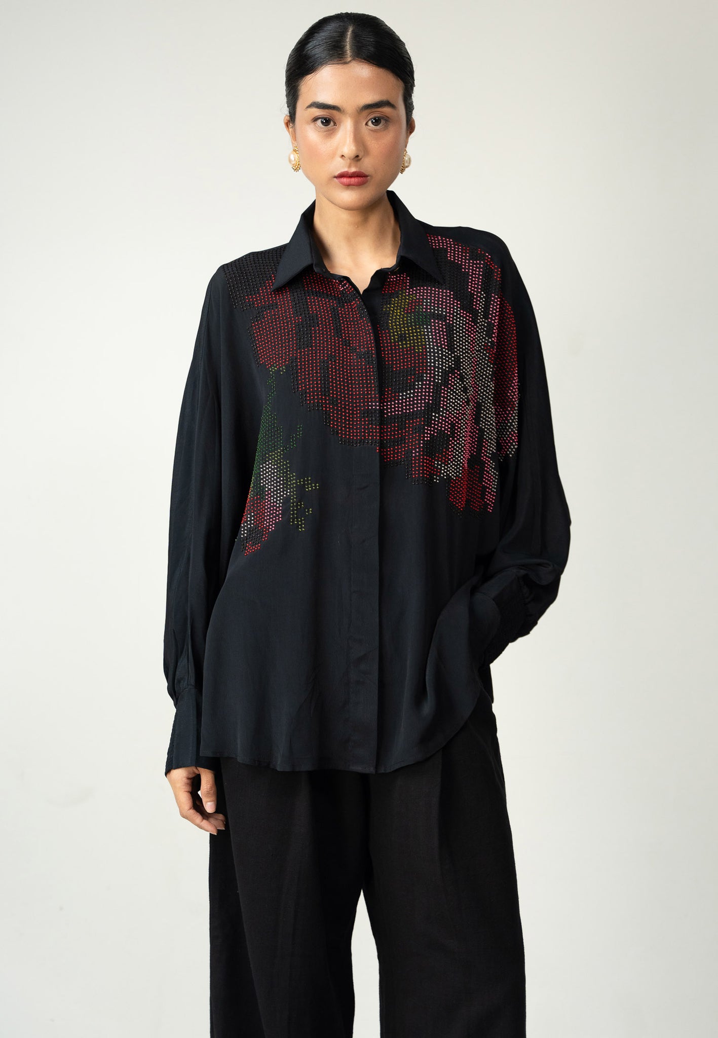 A one-size crepe shirt holding soft glimmers of handcrafted flora—a quiet detail noticed only when one pauses.
