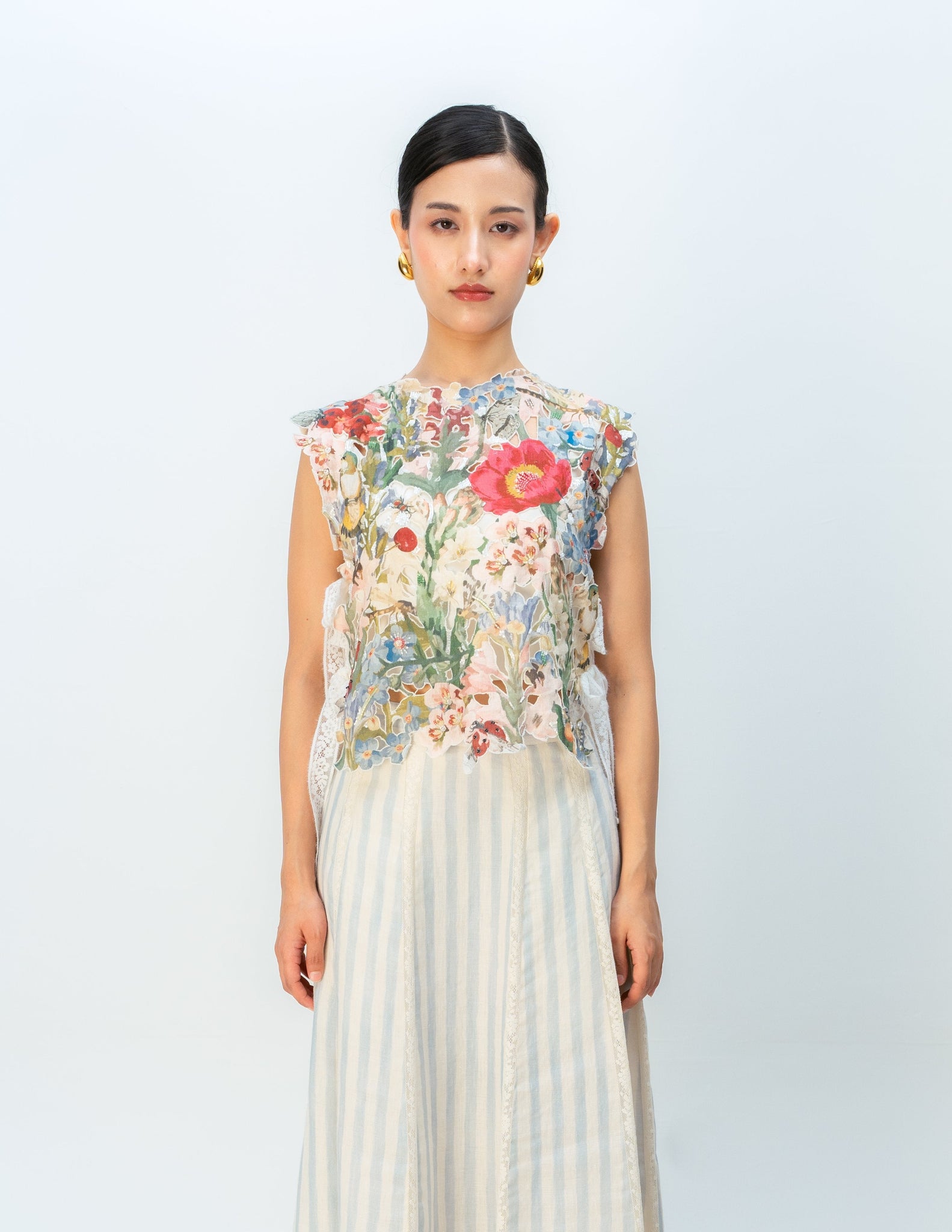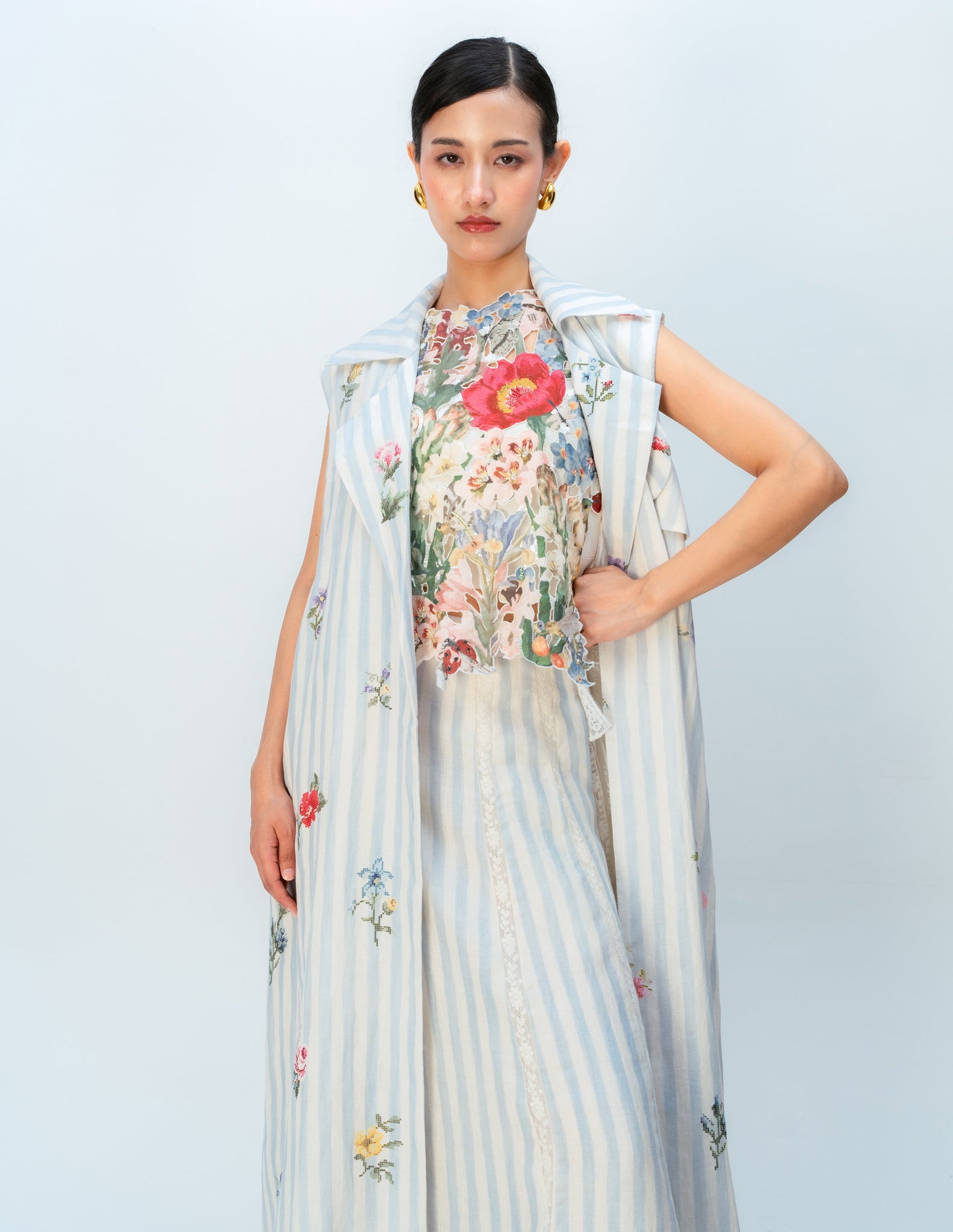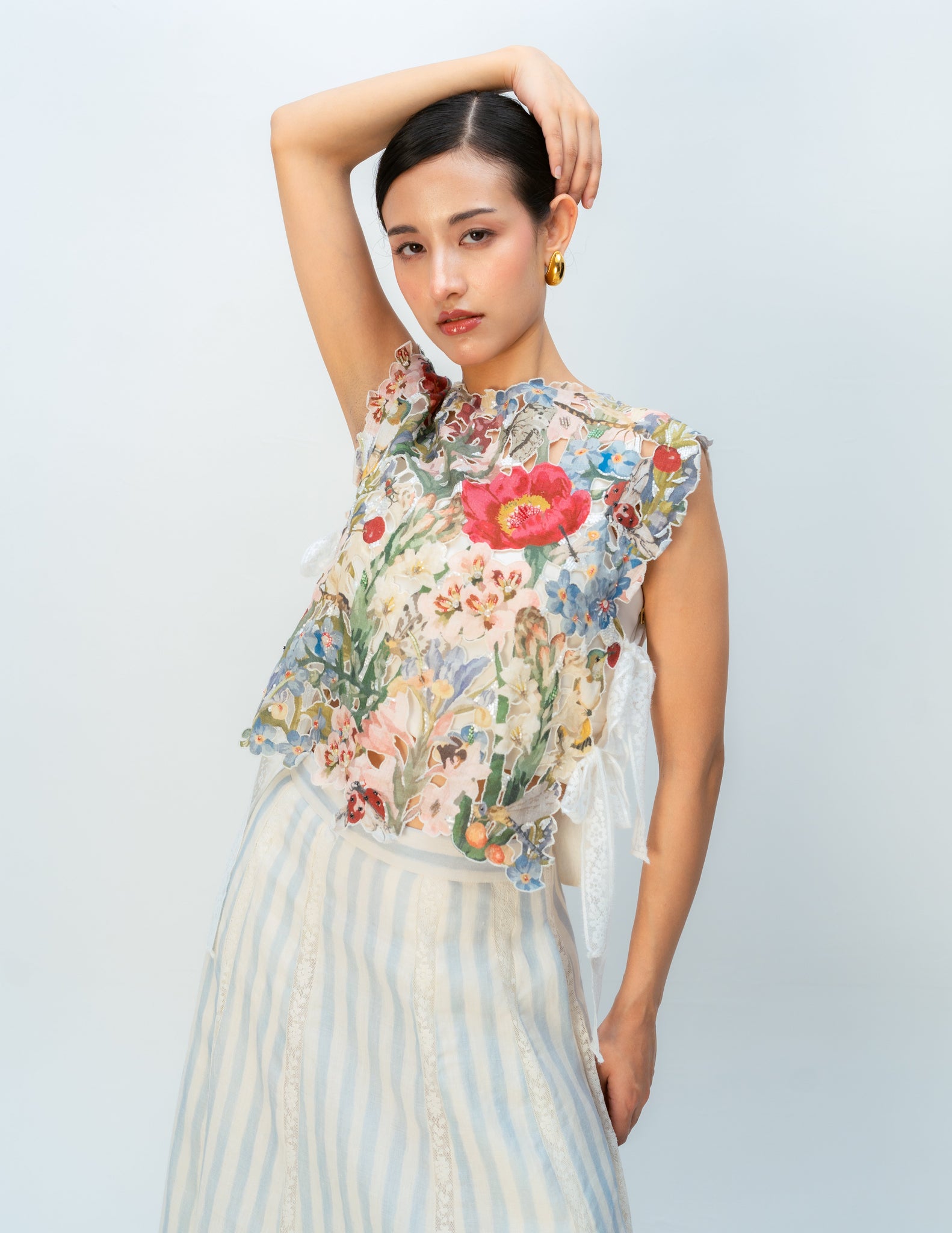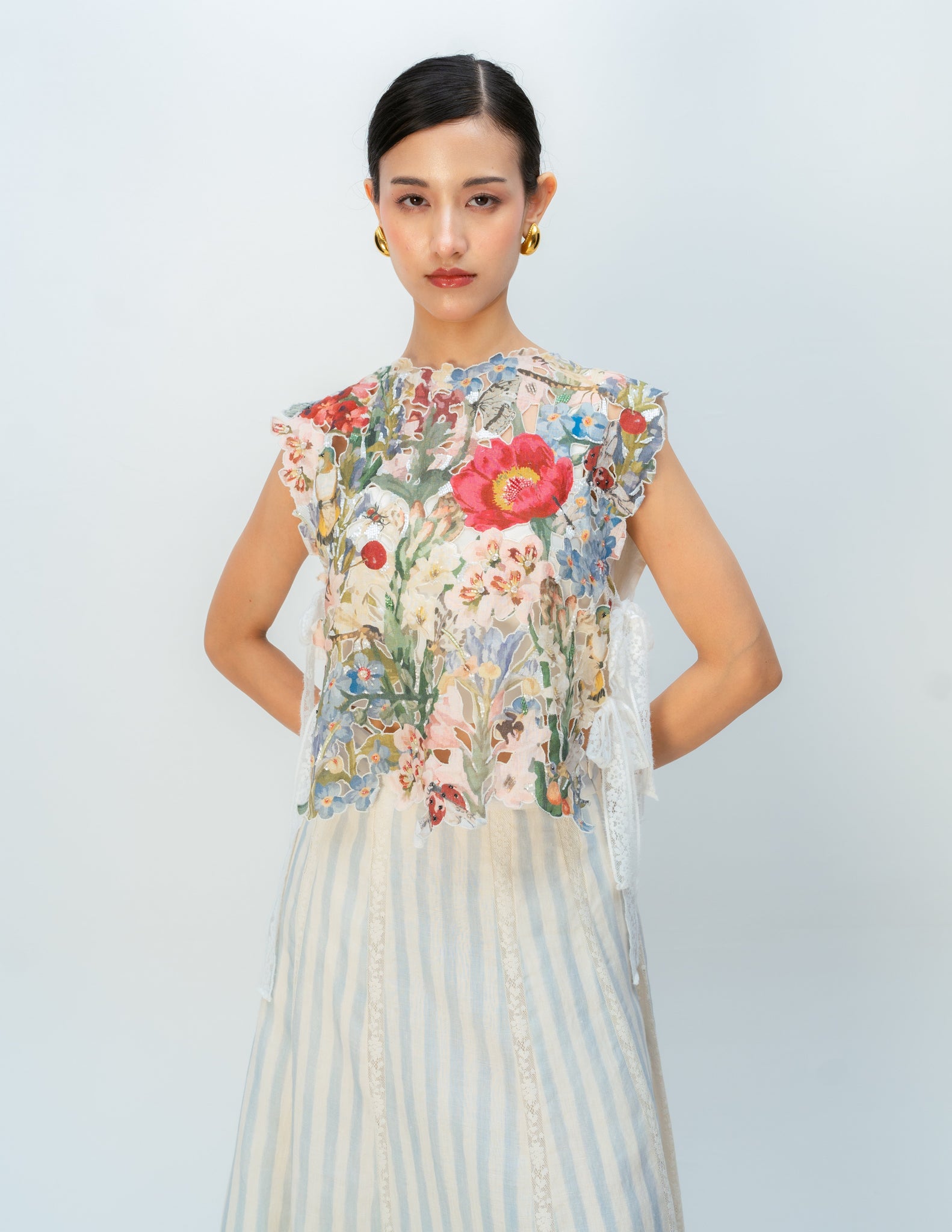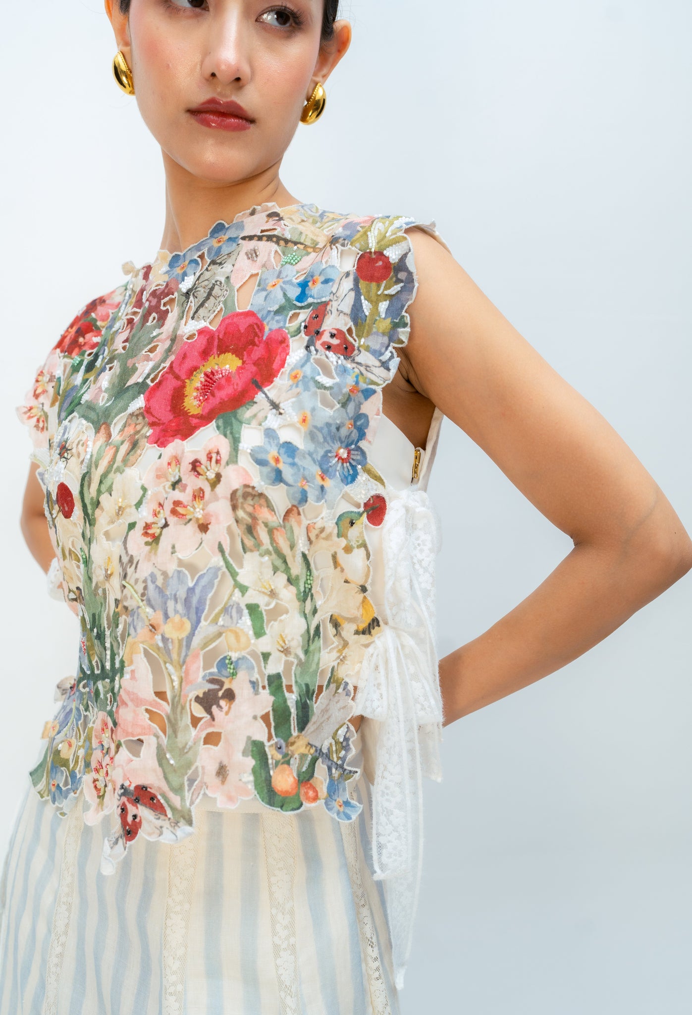 Set against a floral canvas featuring a mix of fine beaded embroidery and delicate cutwork, it offers layer of texture and depth.
