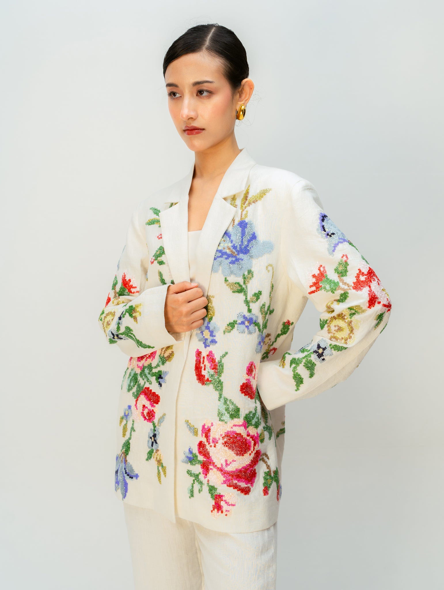 An opulent coat made with intricate allover beaded floral embroidery—an embodiment of refined grandeur and craftsmanship.