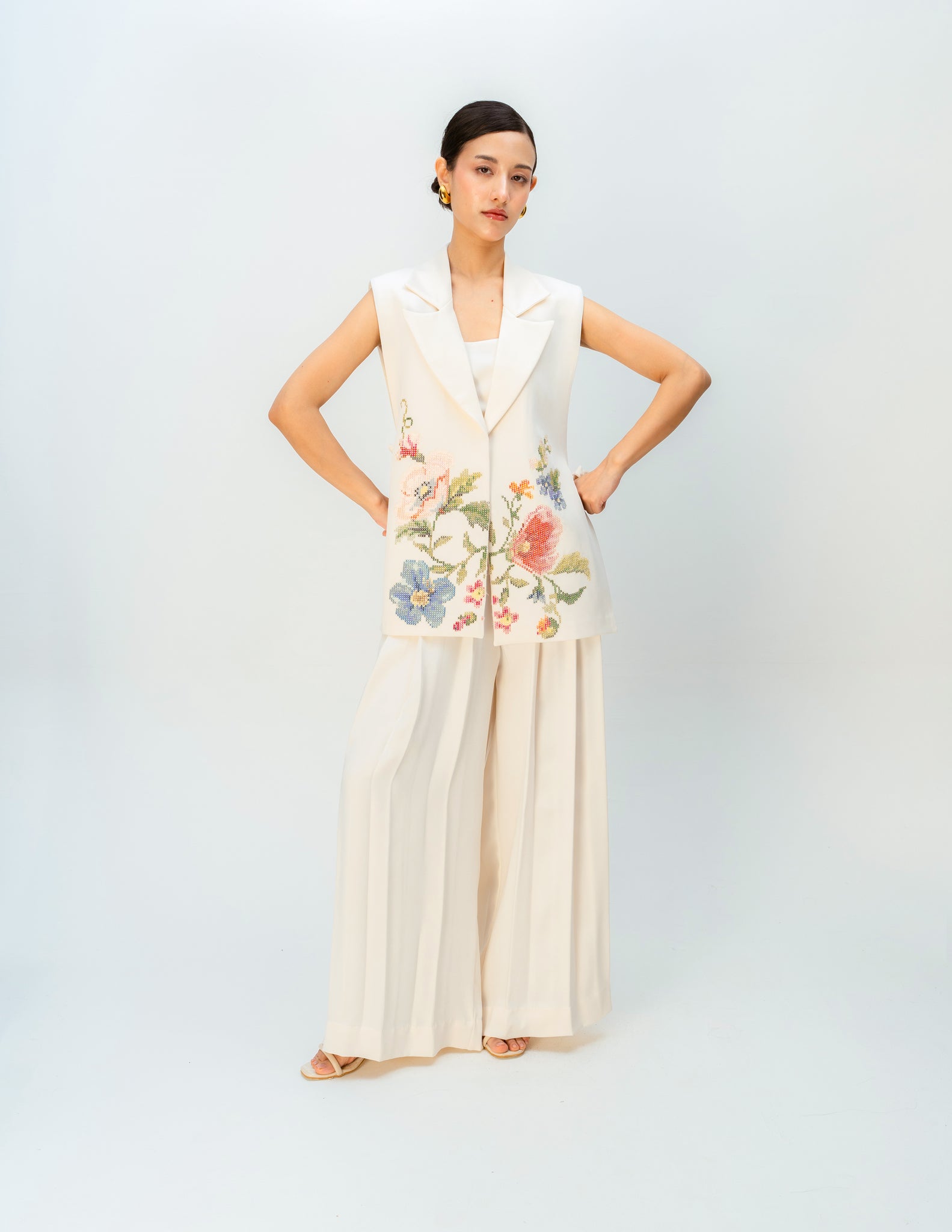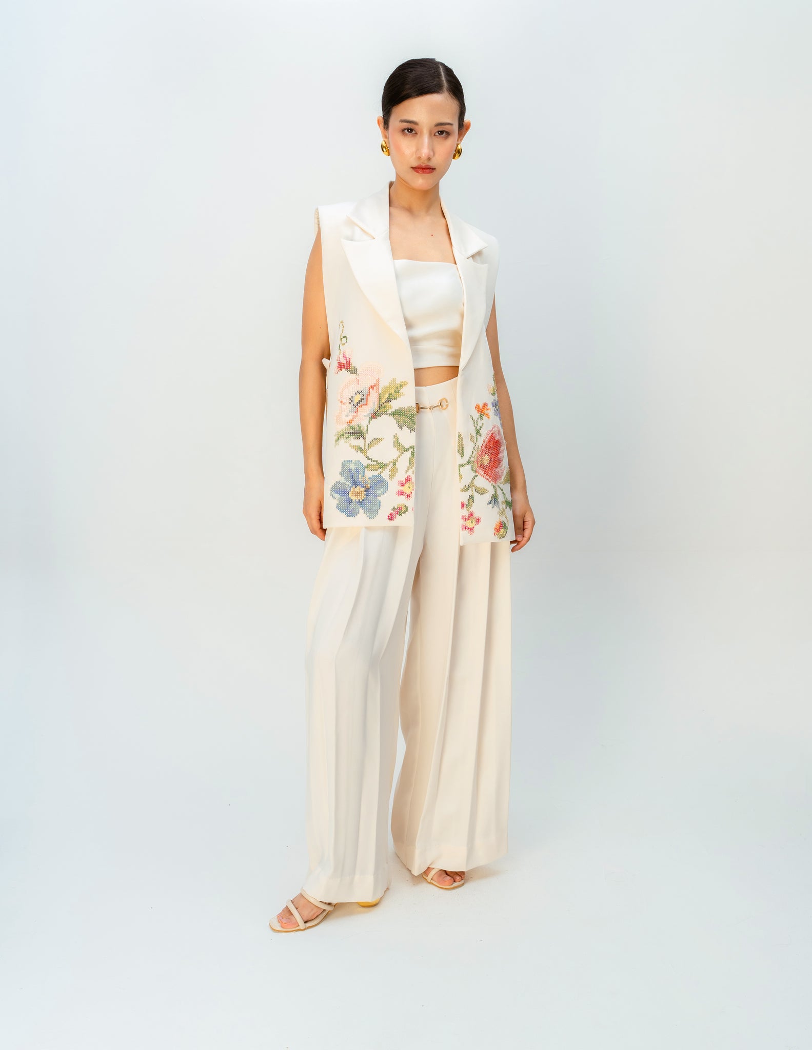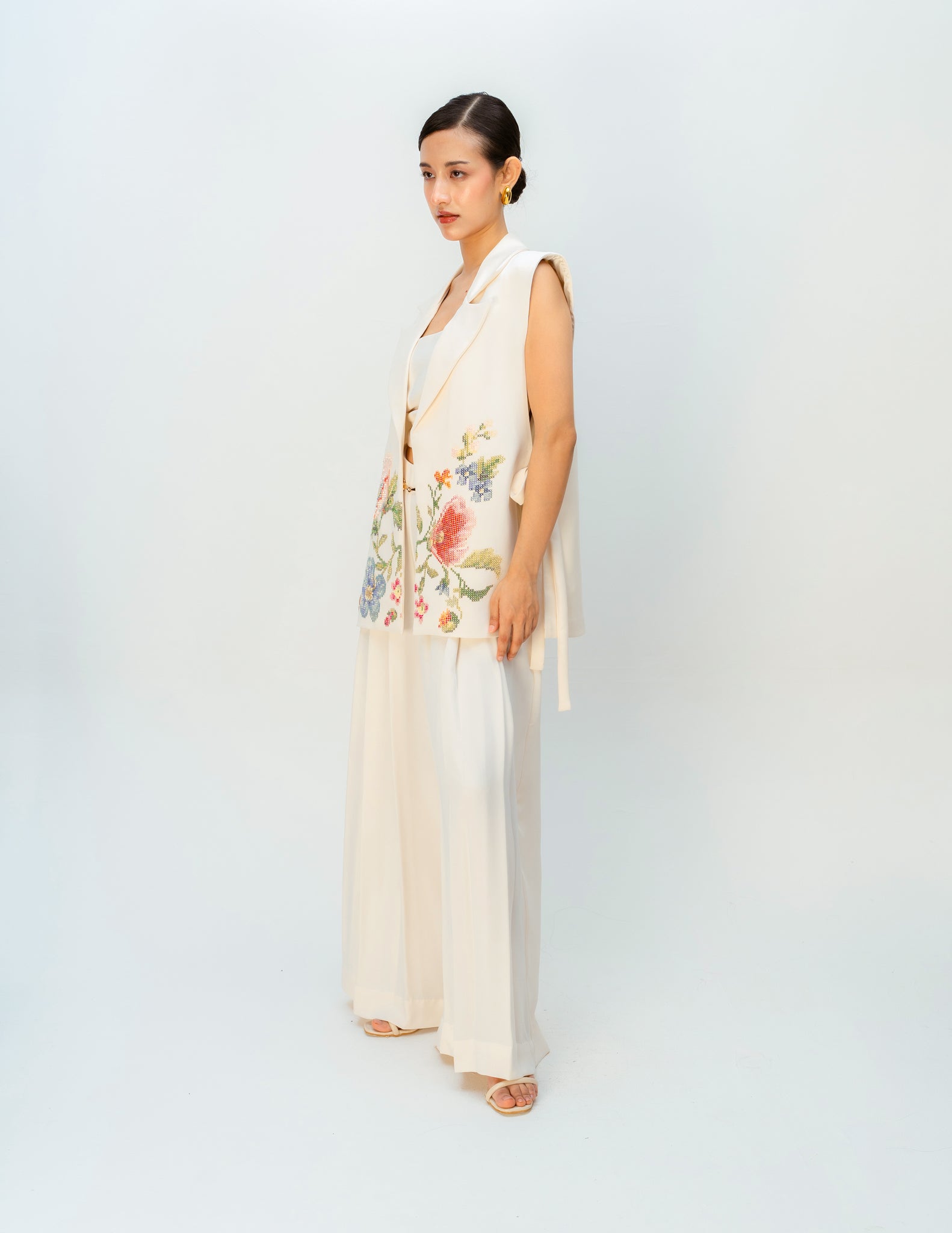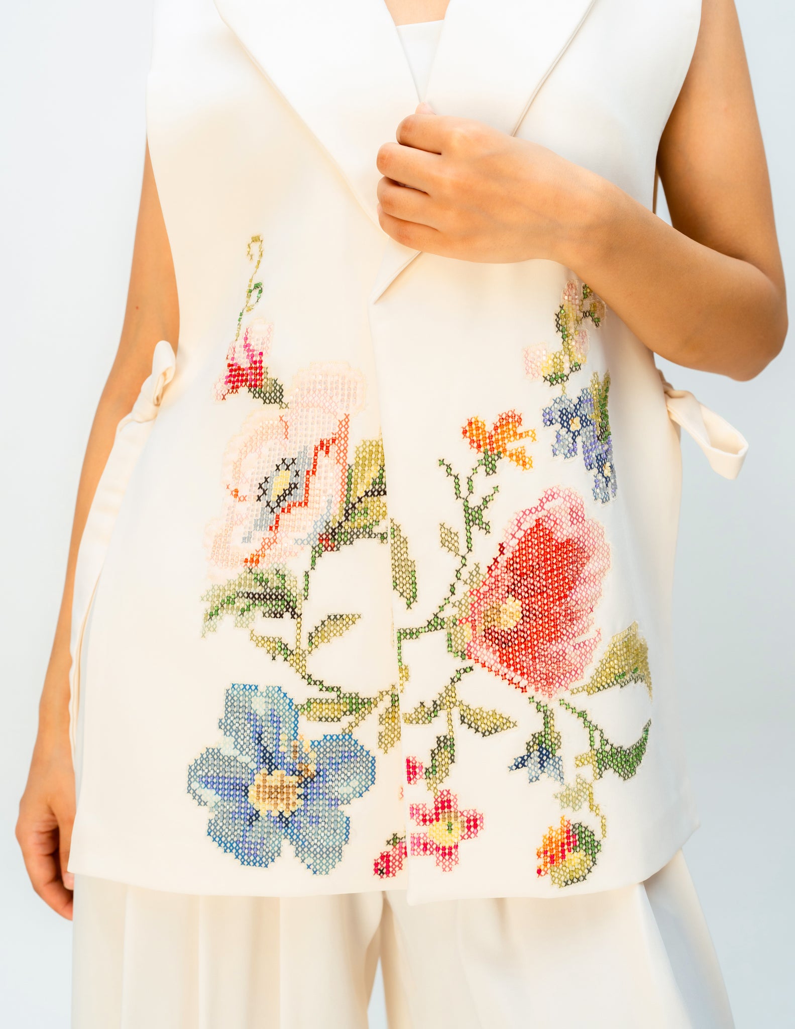 An opulent white jacket adorned with the age-old cross stitch technique, designed with a delicate side tie-up closure—an expression of sculpted elegance.