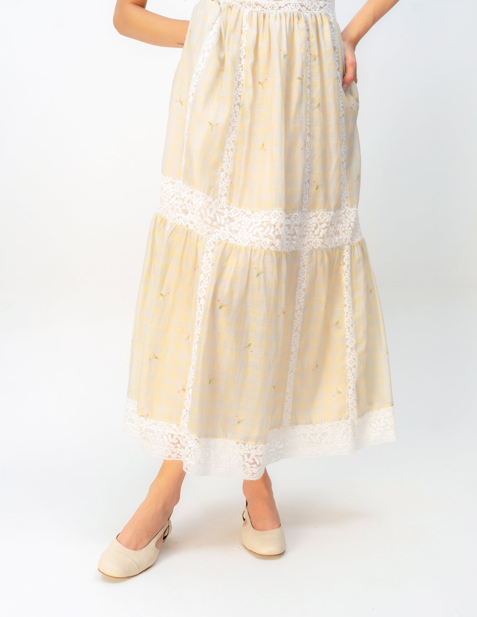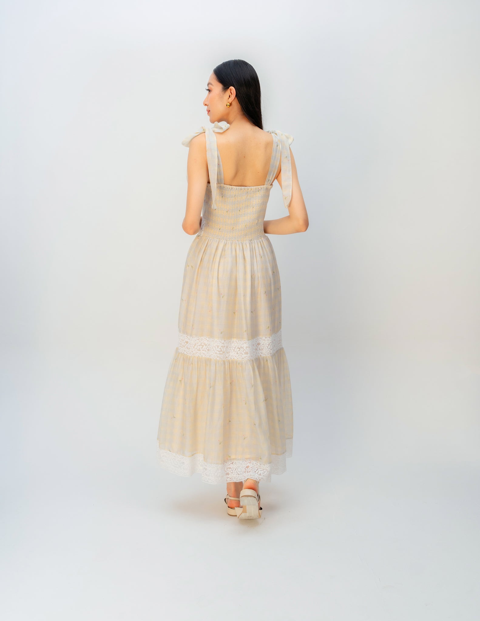 A panelled maxi in a whimsical blend of polka dots and delicate floral speckles, finished with tie-up straps—an ode to nostalgic countryside romance with effortless grace.