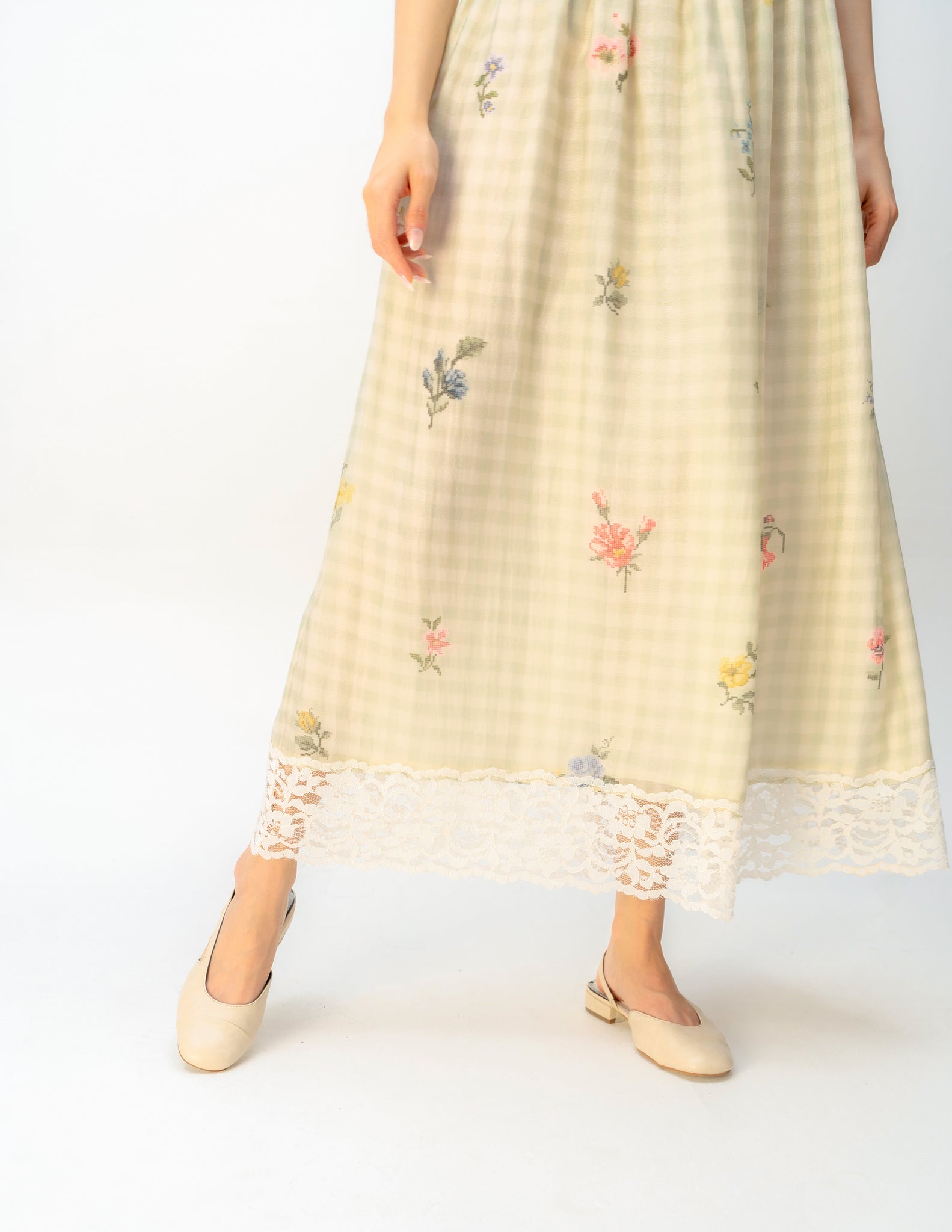 Sheer mesh lace hem insets.
