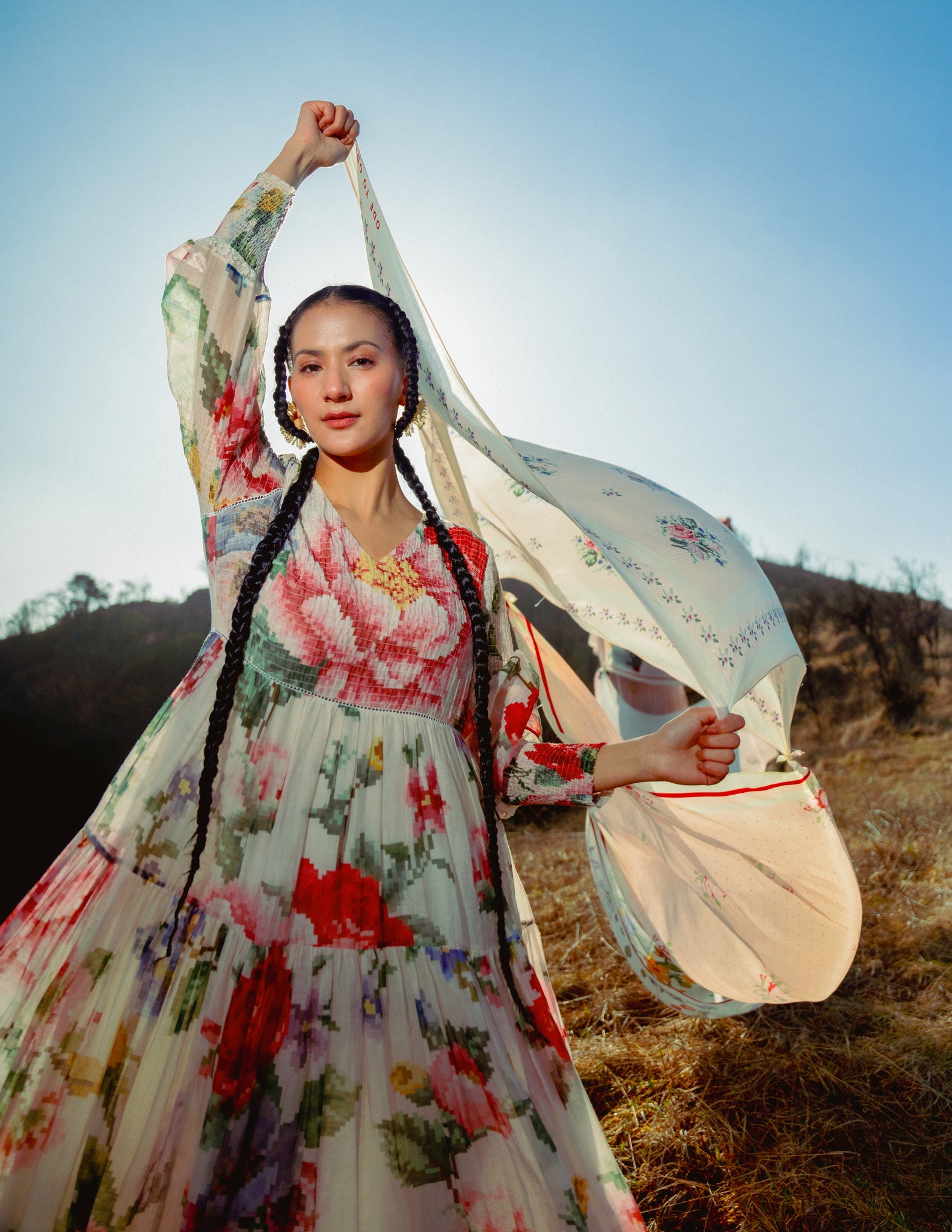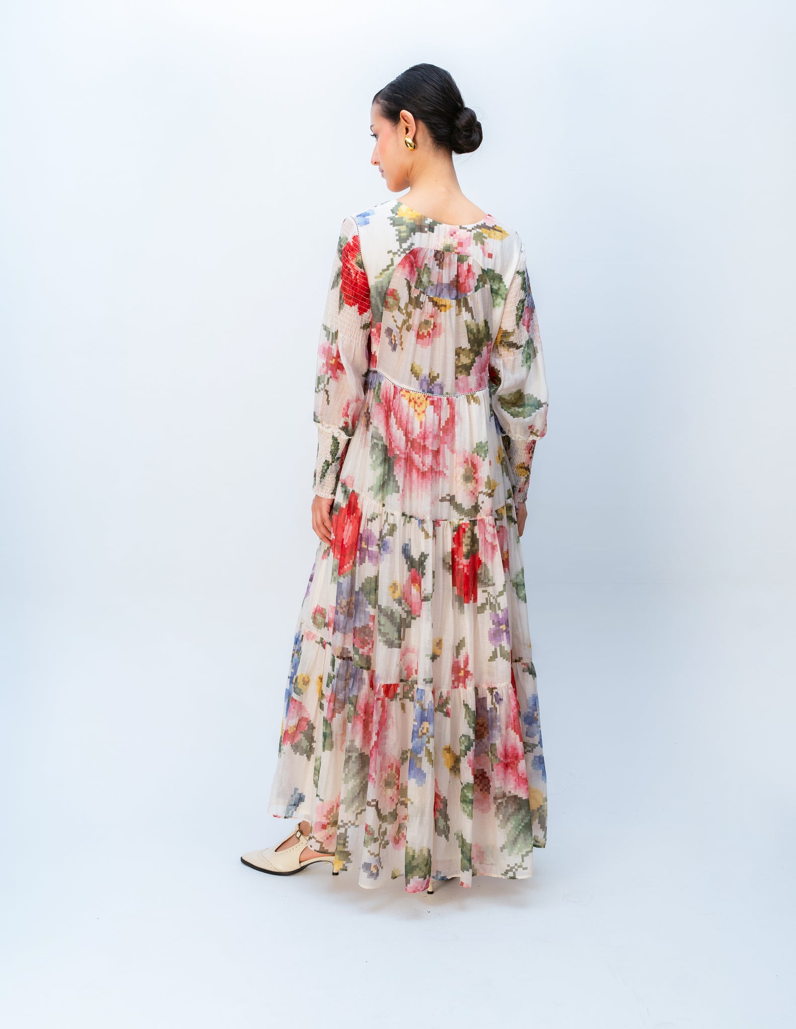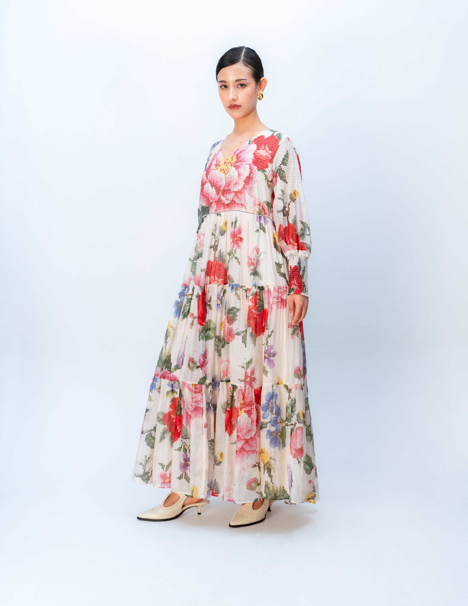 A fluid dress of pixelated florals in painterly hues, made with a graceful A-line fall, elevated with sheer lace inserts.
