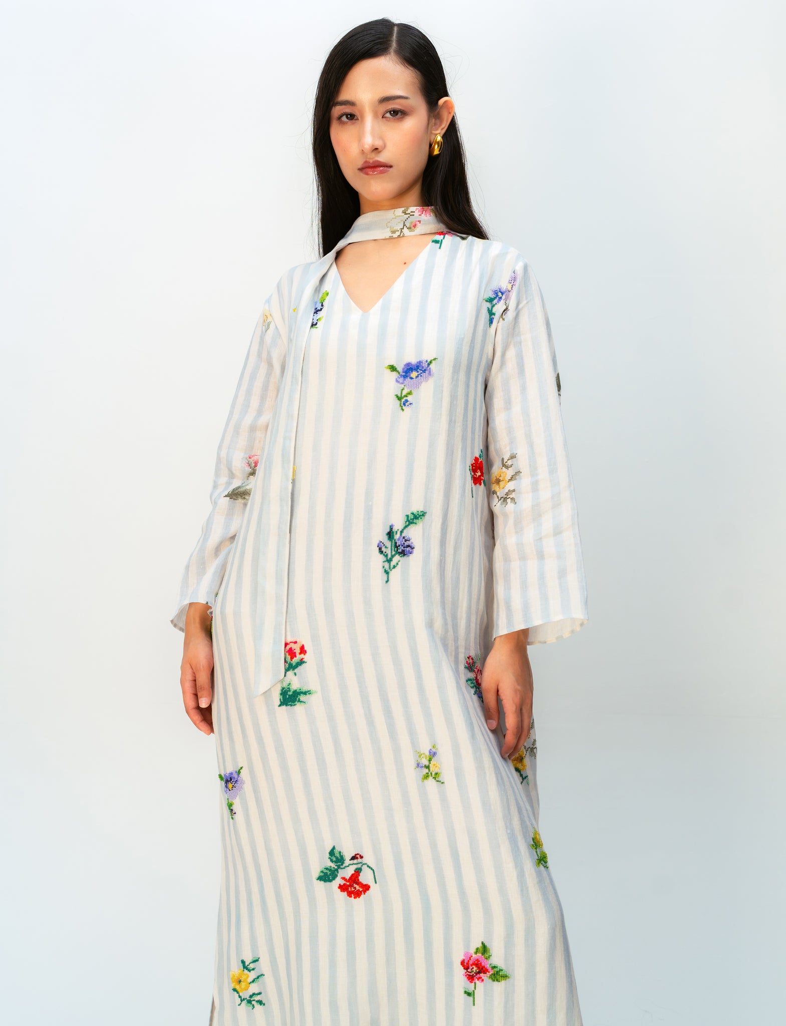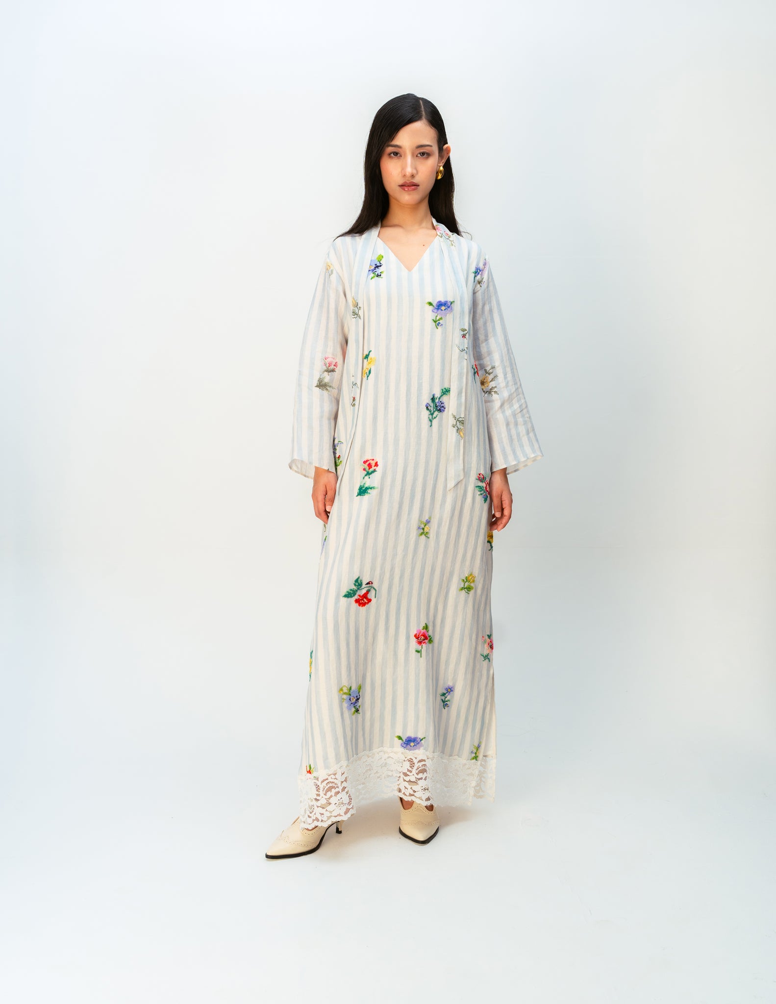 OTO floral poetry imprinted on a kaftan dress holding soft glimmers of handcrafted flora—a piece that feels lived in, unhurried and beautifully simple.