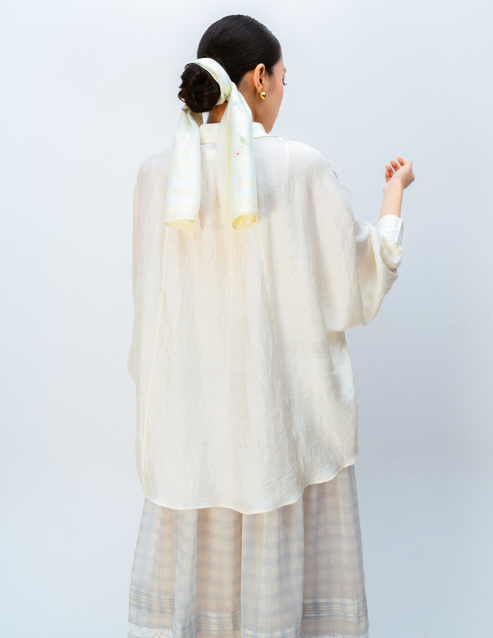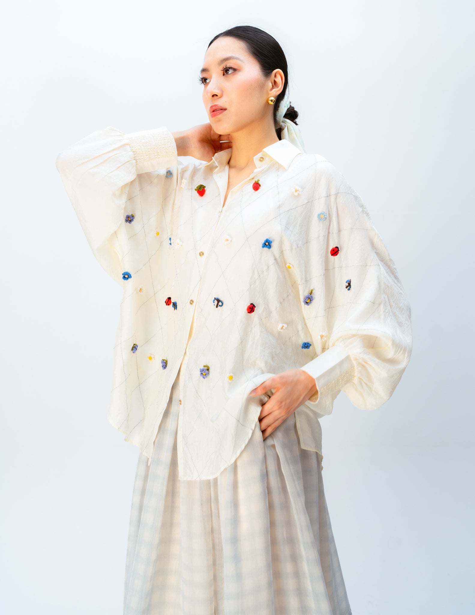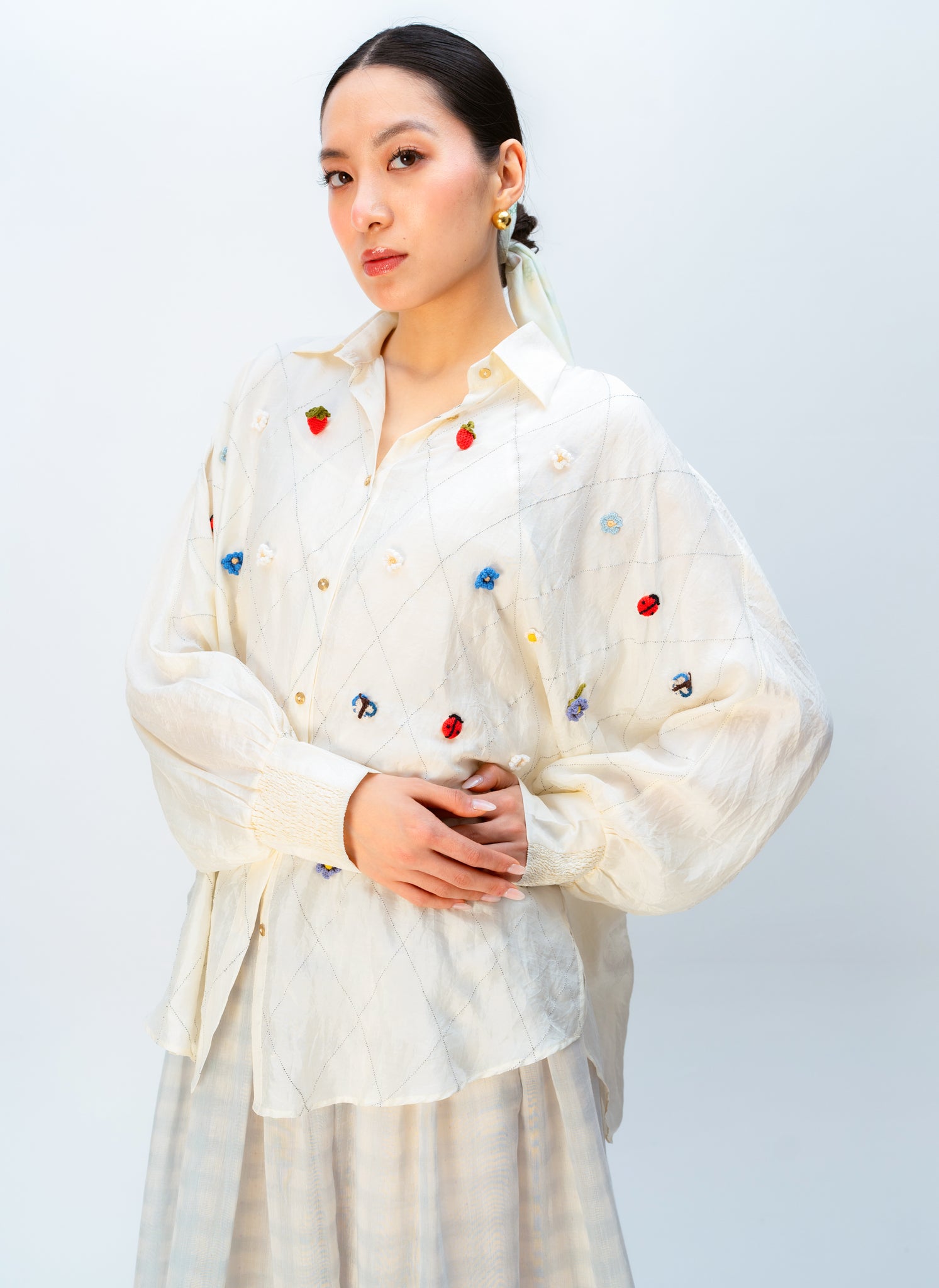 A free size silk shirt embracing hand-crocheted floral blooms and delicate bugs on a silk base—an ode to craftsmanship.