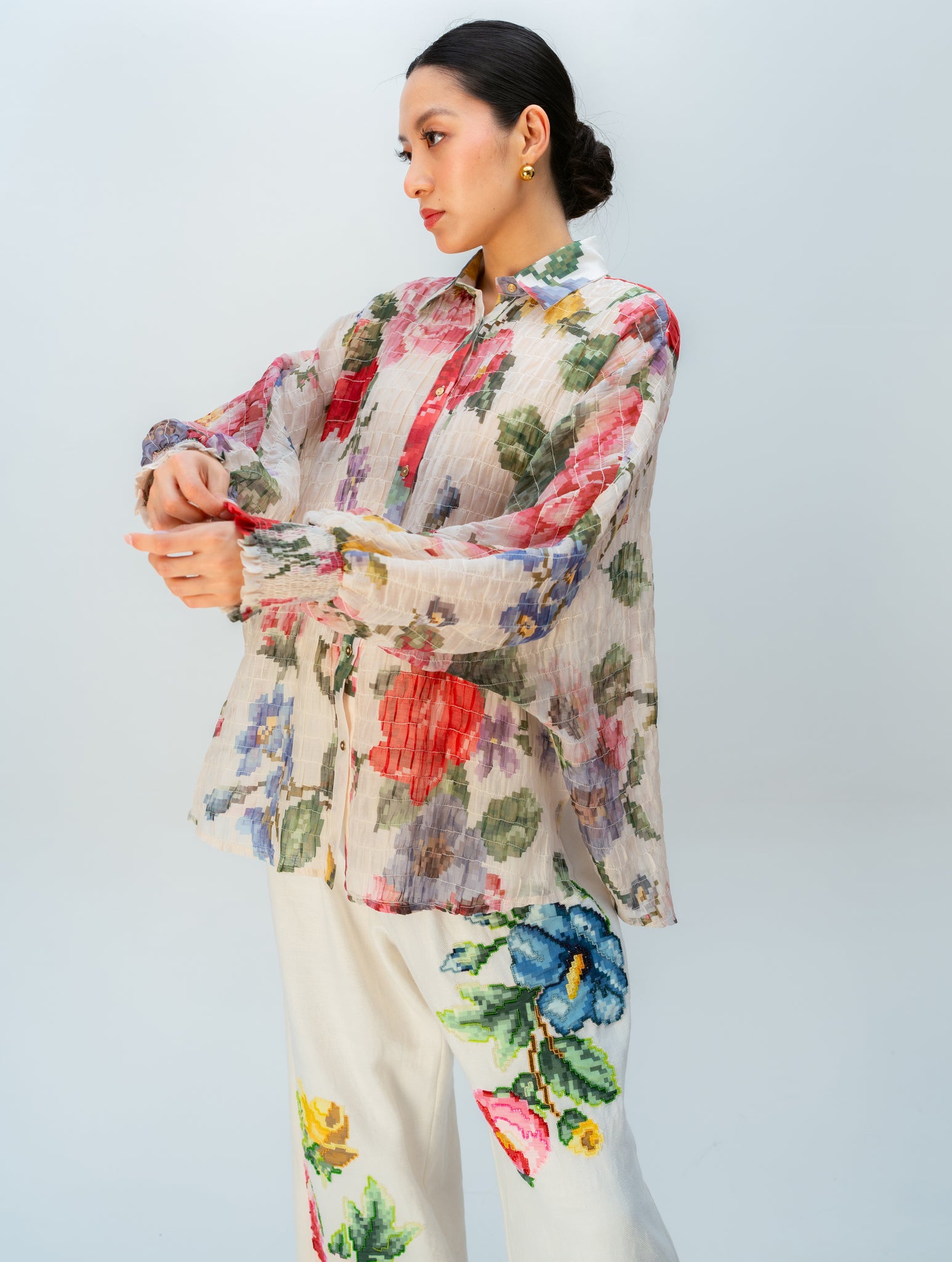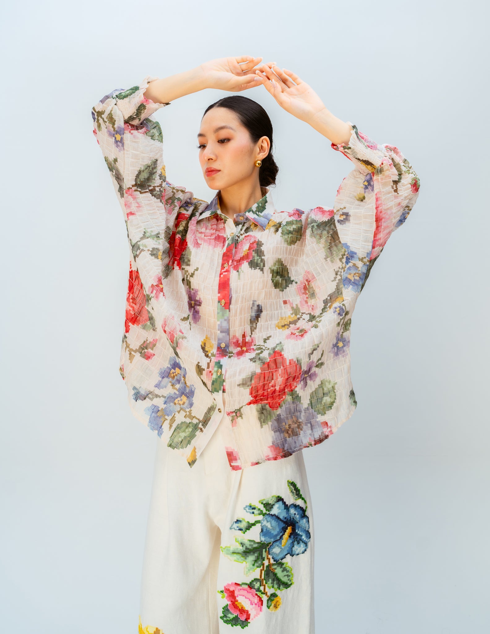 A free size shirt scattered with impressionistic, pixel-like florals—an effortless blend of modern expression and texture.